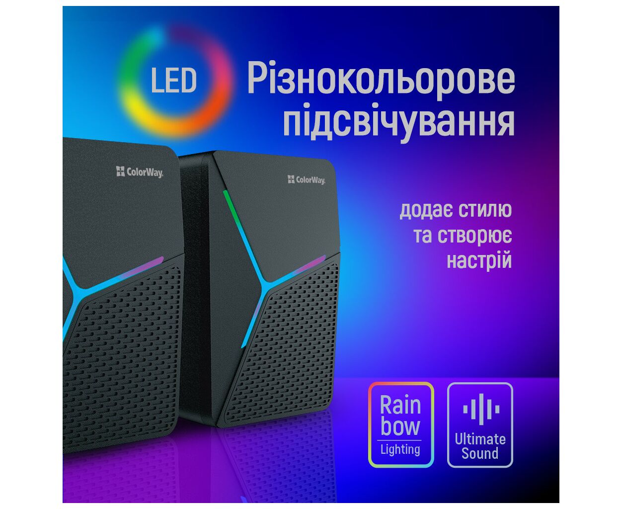 Компактные стерео-колонки ColorWay с аудиоразъёмом 3,5 мм и питанием через USB A — идеальный выбор для ноутбуков, ПК или планшетов. Яркая LED-подсветка создаёт приятную атмосферу при прослушивании музыки или просмотре фильмов.