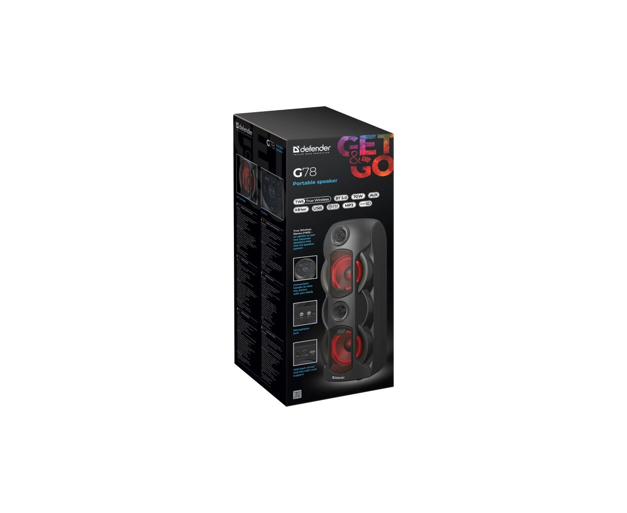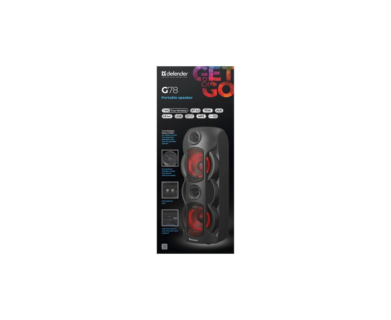 Акустическая система Defender G78 Black (65178) — это отличный выбор для тех, кто ценит высокое качество звука и надёжность. Это портативные колонки с беспроводным подключением, которые добавят ярких красок вашему отдыху и особым мероприятиям. Обладая мощностью 70 Вт, эта система создаёт невероятно мощный звук, который приятно вас удивит.