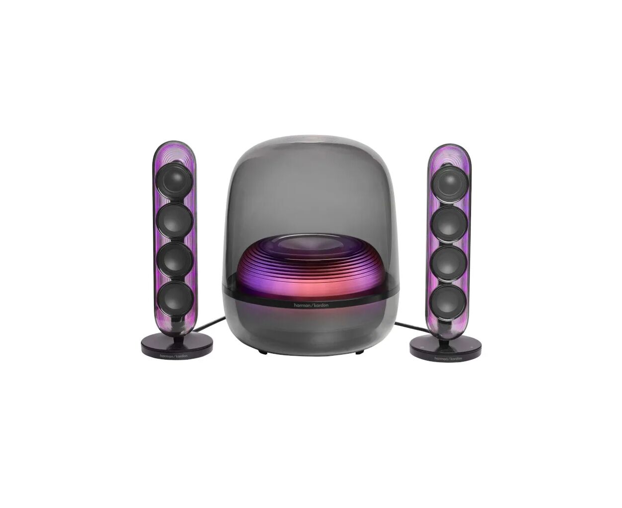 Сателлитные колонки и сабвуфер создают захватывающее световое шоу с насыщенными цветами и динамичным движением, преображая ваши ощущения от прослушивания благодаря насыщенным цветам и плавным движениям, которые идеально подходят для любого настроения.