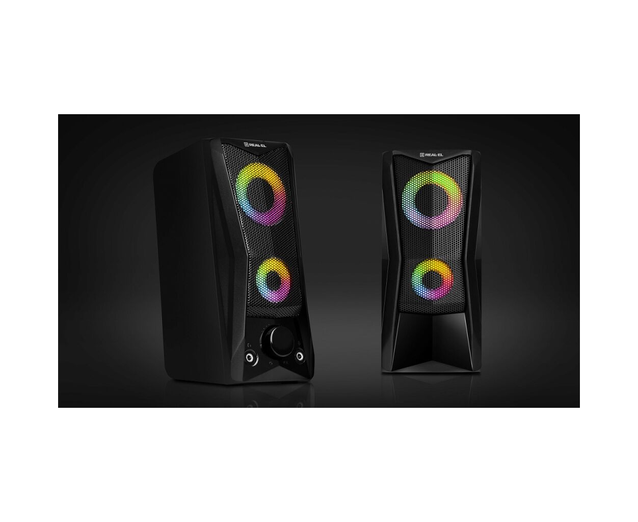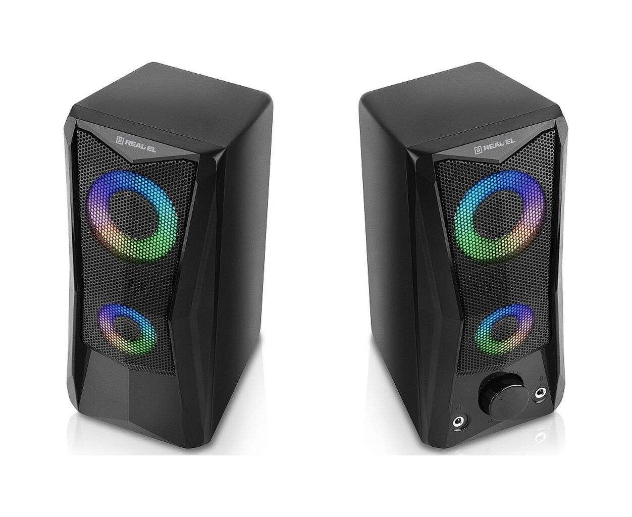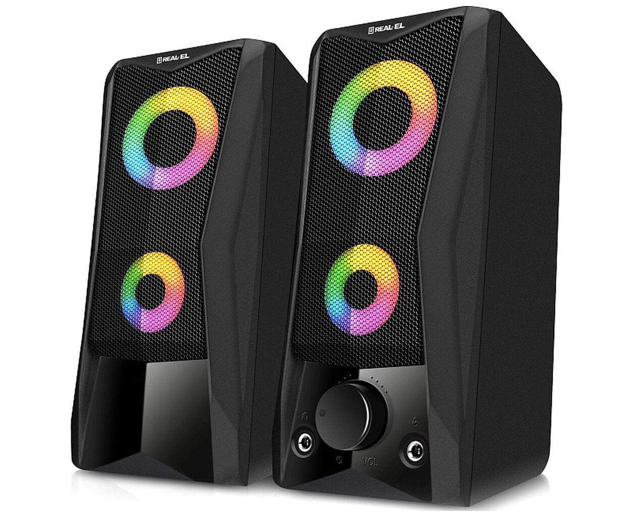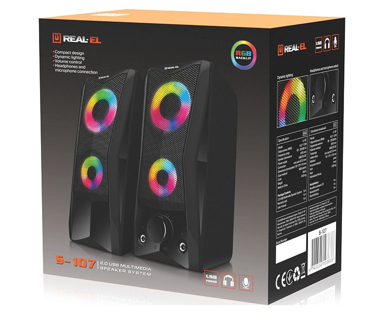 REAL-EL S-107 имеет удобный регулятор громкости и дополнительные разъёмы для подключения наушников и микрофона. Яркая подсветка придаёт динамичности и создаёт приятную атмосферу во время работы за компьютером или отдыха с любимой музыкой.