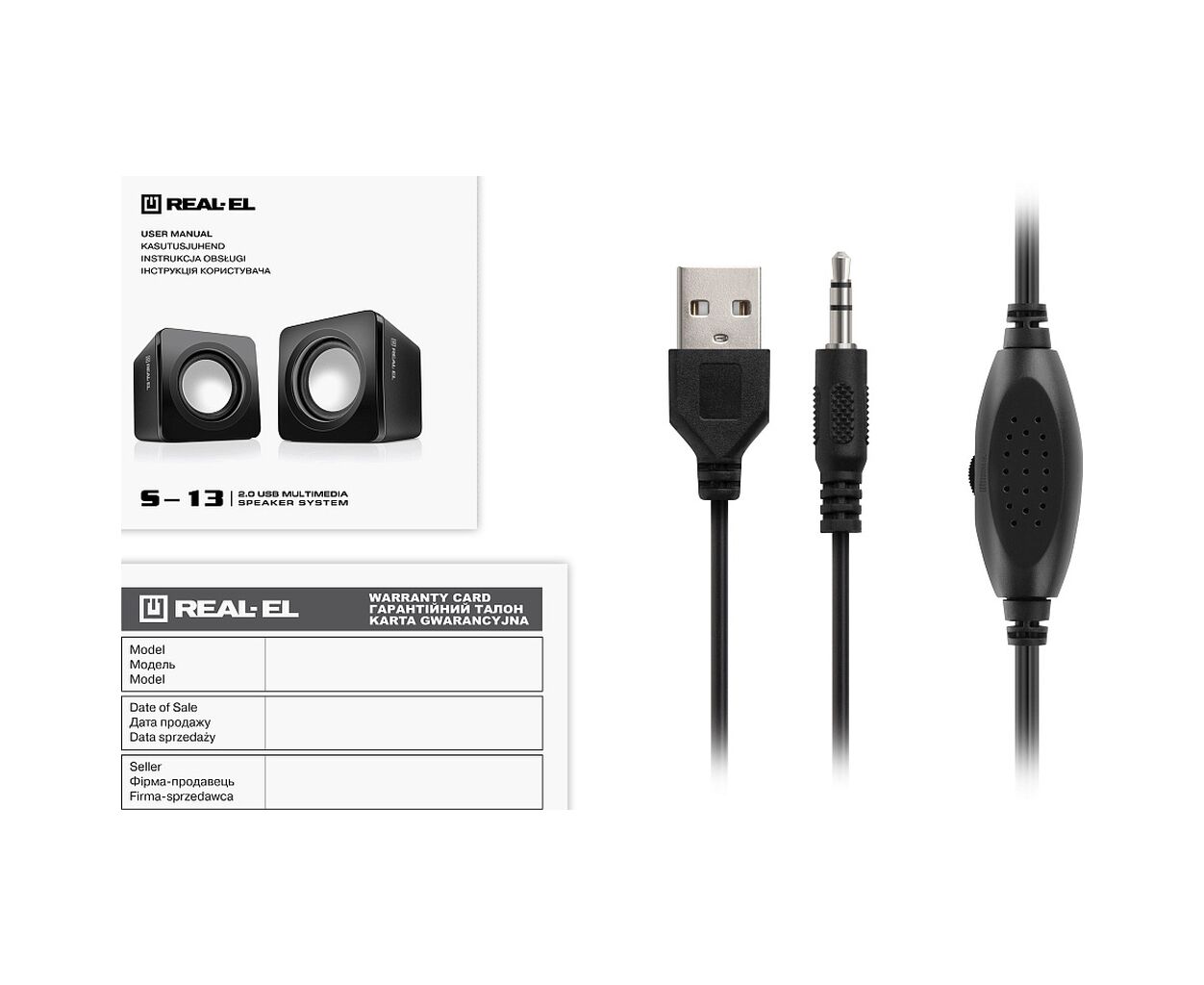 - Мультимедийная USB-акустическая система REAL-EL S-13 — это лёгкое и доступное решение для воспроизведения звука с компьютера или ноутбука. Благодаря компактному дизайну колонки занимают минимум места и идеально подходят для небольших рабочих столов.