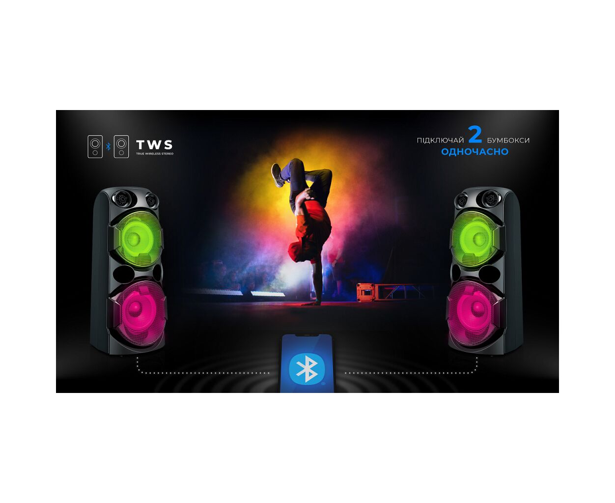 Ідеальна як для домашніх тусовок, так і для вечірок на природі — бери її з собою куди завгодно. Підключай смартфон через Bluetooth, вставляй флешку або карту пам’яті, використовуй AUX — ти завжди маєш вибір, як слухати улюблену музику. А якщо хочеш ще більше звуку — активуй режим TWS, об'єднай дві колонки в одну бездротову 160 Вт стереосистему.