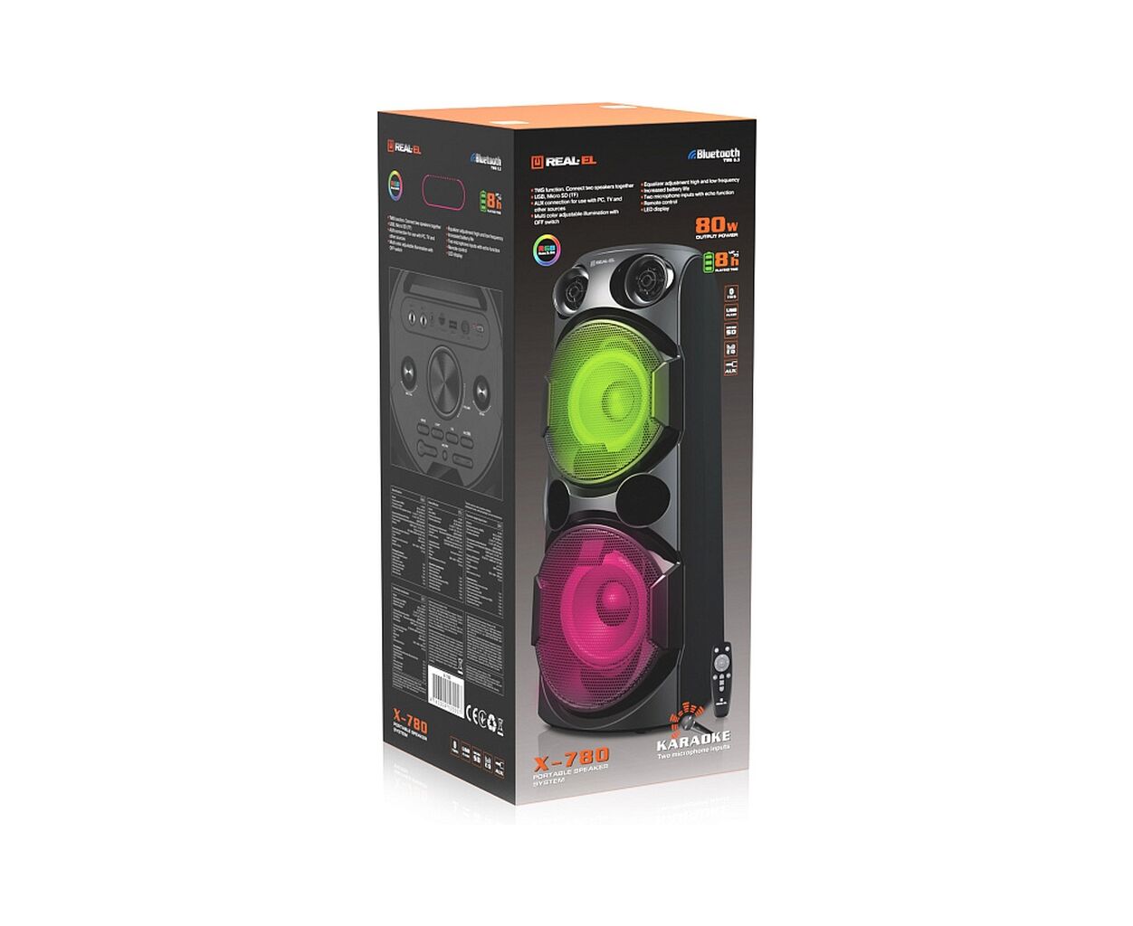 REAL-EL X-780 — потужний стиль, гучний характер! REAL-EL X-780 — це потужна 80Вт-на портативна акустична система. Вона оснащена двома динаміками 2 х Ø 5.7″ (145 мм) + 2 х Ø 1.25″ (32 мм), які забезпечують глибокий бас, яскраву середину та чіткі високі частоти для неймовірного захоплюючого звучання.