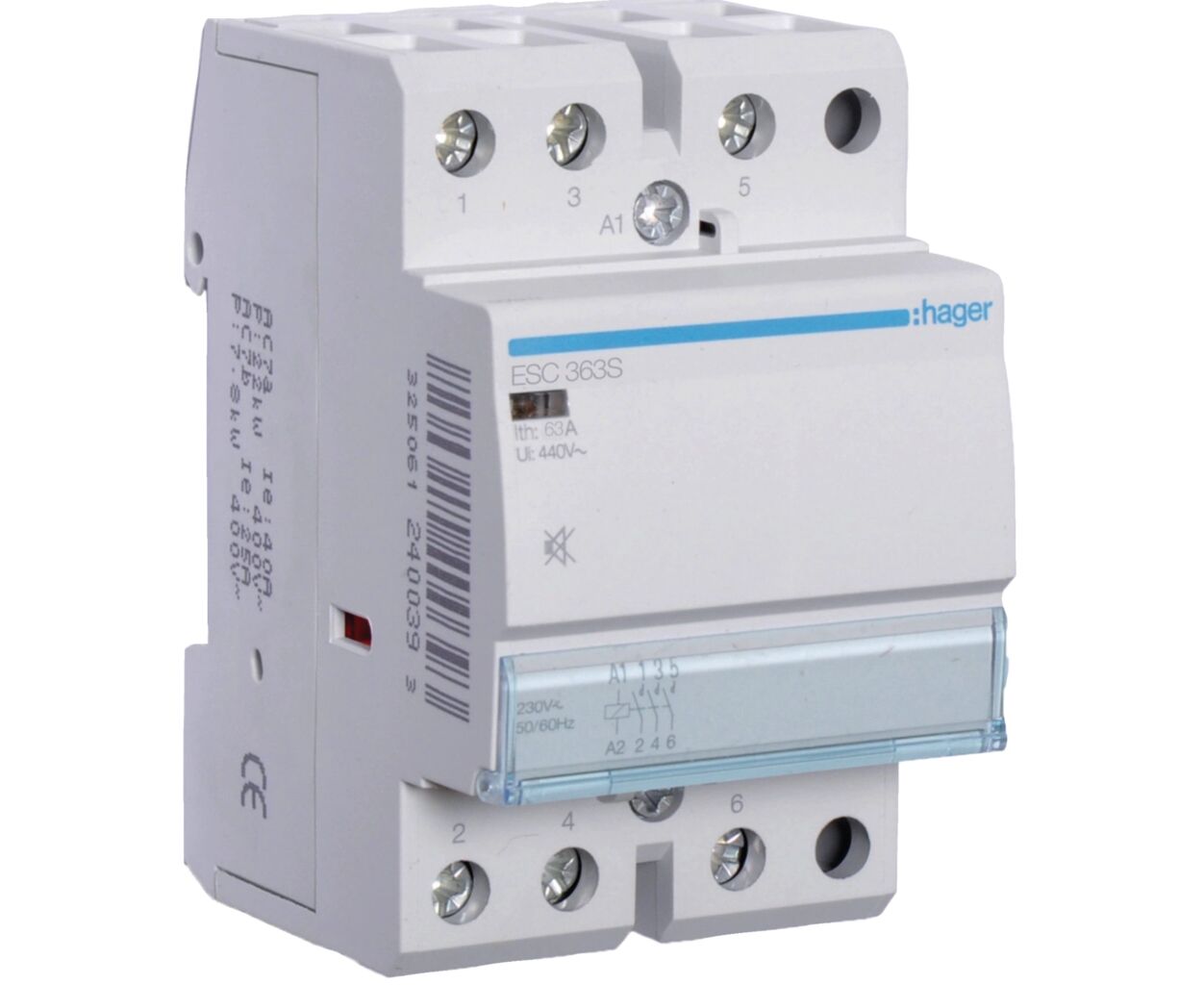 Модульный пускатель (контактор) ESC363 Hager 230В 63 A имеет 3 нормально-открытых контакта (НО). Пускатель используется для пуска двигателей, частых включений сетей освещения и прочих электрических нагрузок.