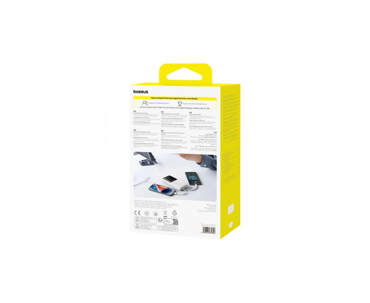 Ёмкость - 20000 mAh, электрохимическая система - Li-pol, Источник заряда батареи - USB Type C, интерфейсы подключения (выход) - USB Type-C, USB, выходной ток - 1.5 A, 3 A, 2.22 A, 1.67 A, размер - 152.2 x 69.6 x 30.7 мм, вес - 435 г, Цвет - белый