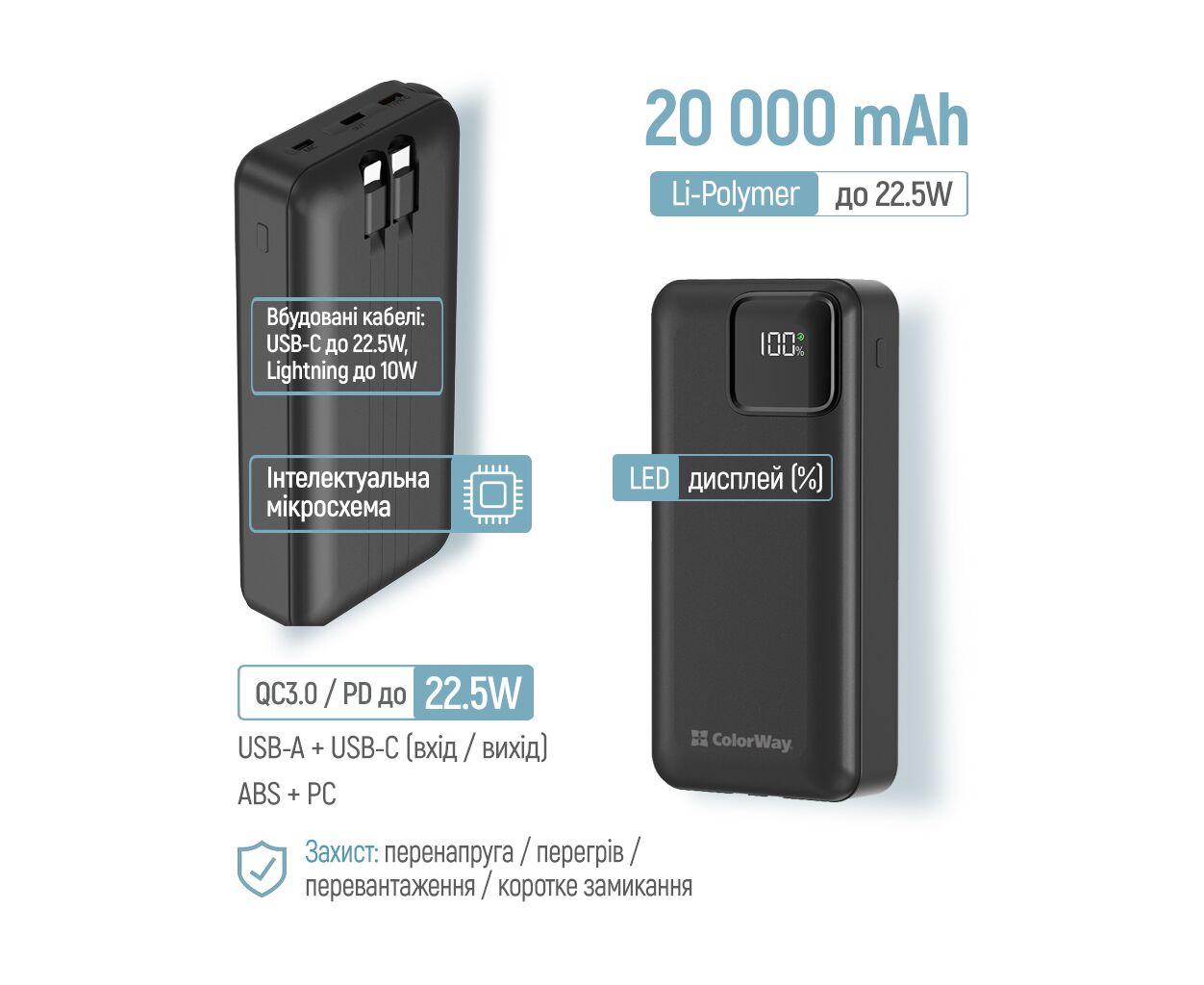 Характеристики Батарея универсальная ColorWay 20 000 mAh Optimal Power PD/22.5W, QC/3.0, Black (CW-PB200LPB5BK-PDD)