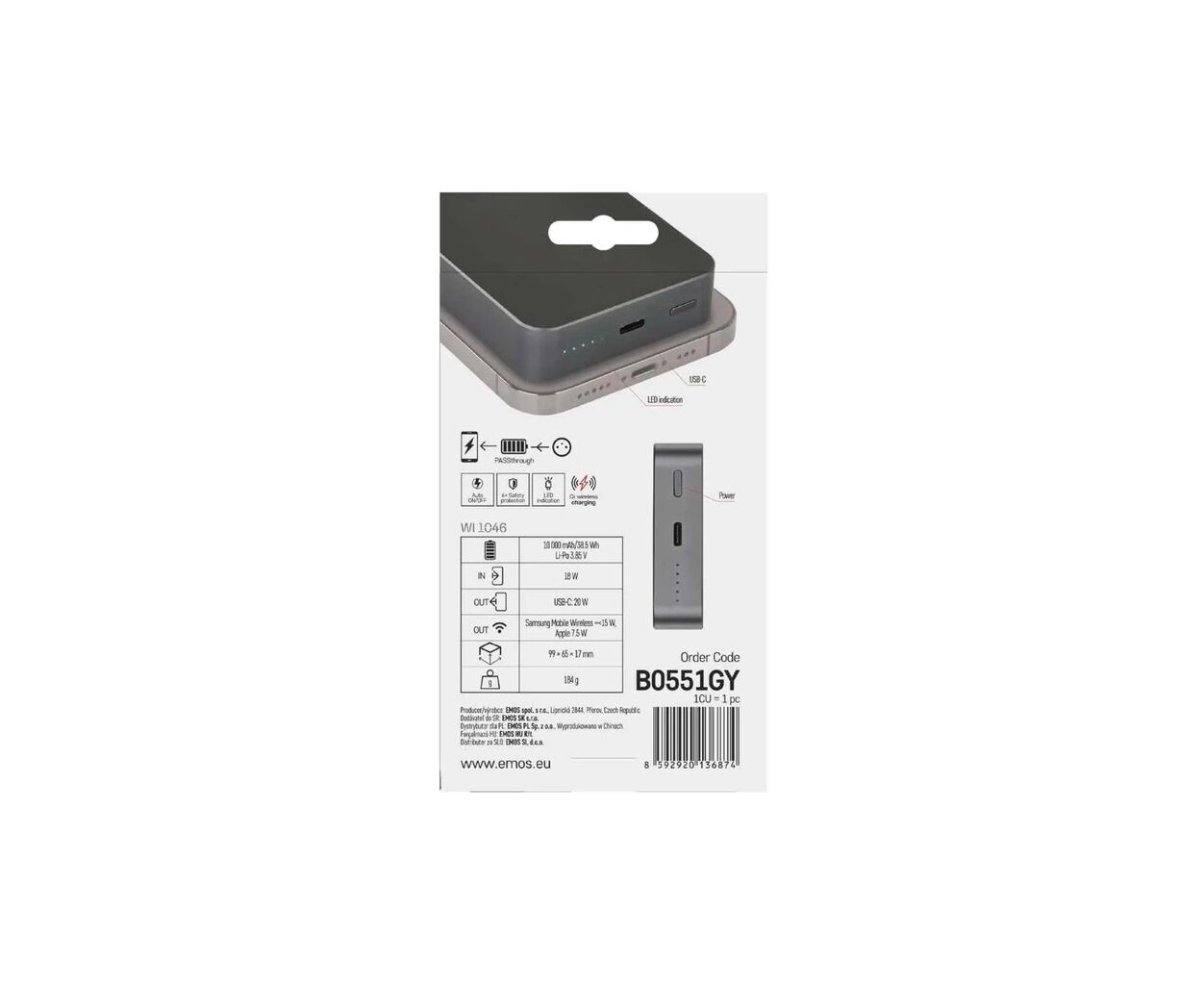 Батарея универсальная EMOS 10000mAh WI1046, 20W, Wireless, grey (B0551GY)