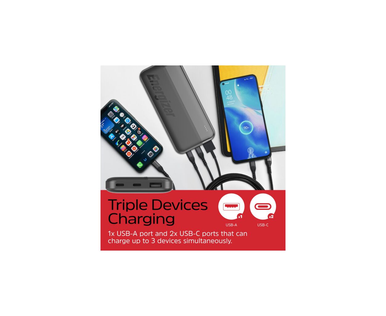 Описание Батарея универсальная Energizer 10000mAh 15W, USB-А, 2*USB-C, Black (UE10050CC)