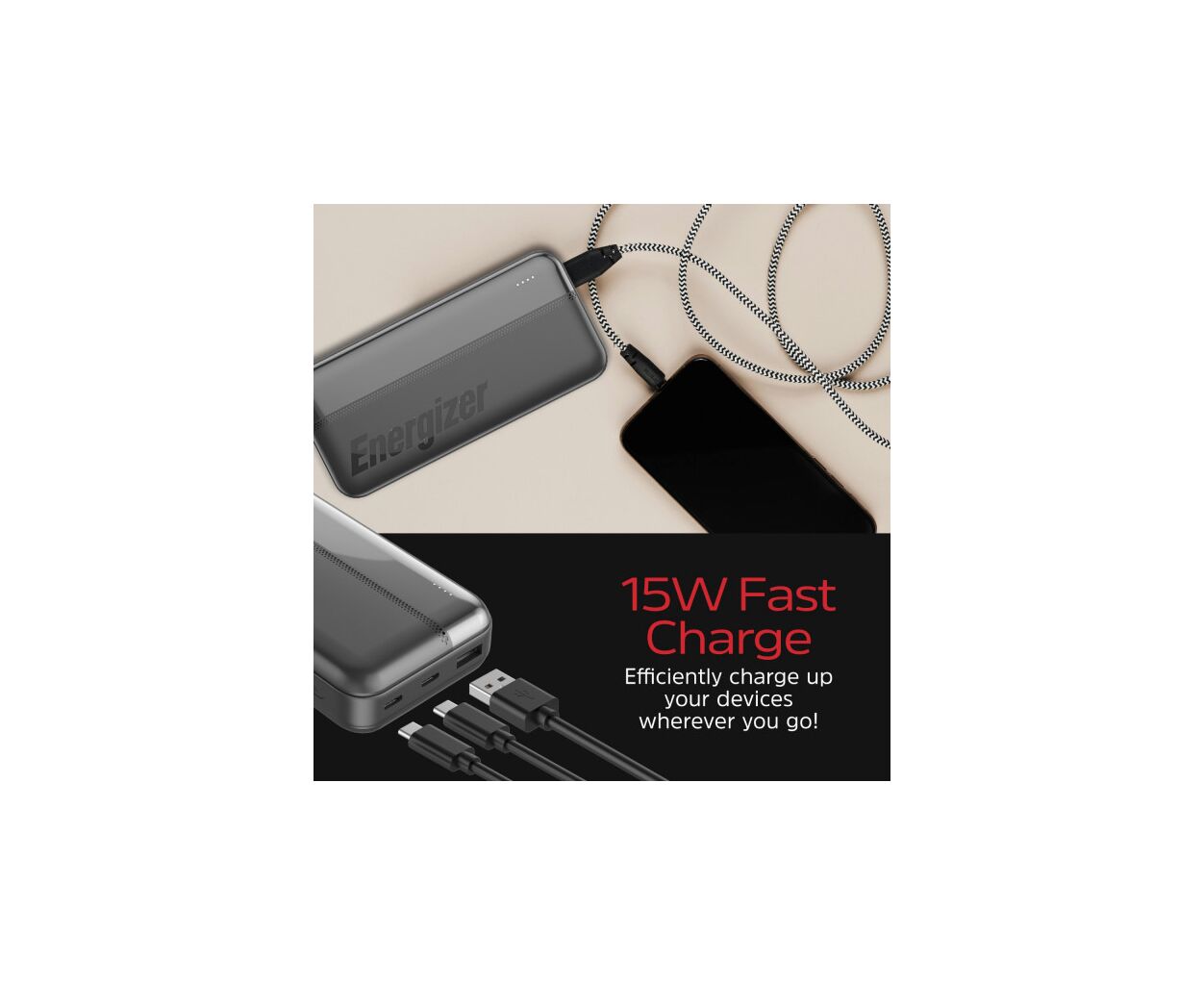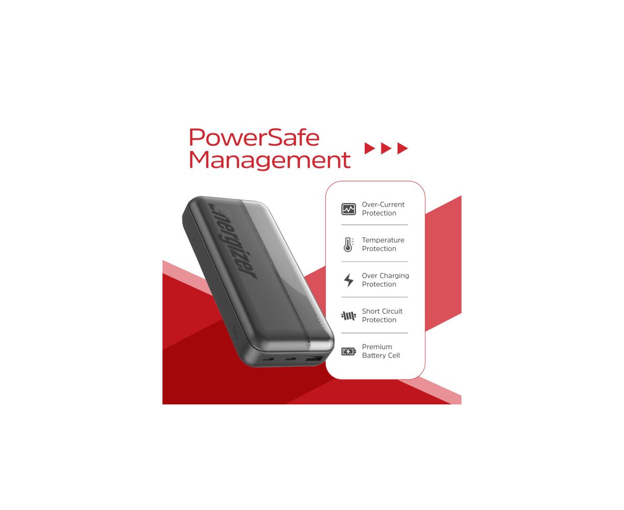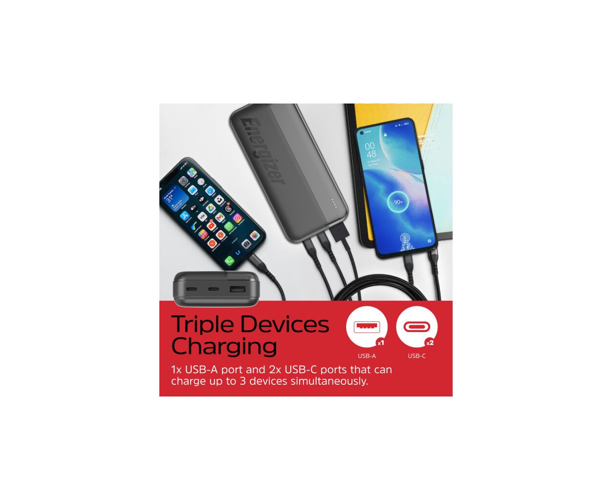 Описание Батарея универсальная Energizer 20000mAh 15W, USB-А, 2*USB-C, Black (UE20050CC)