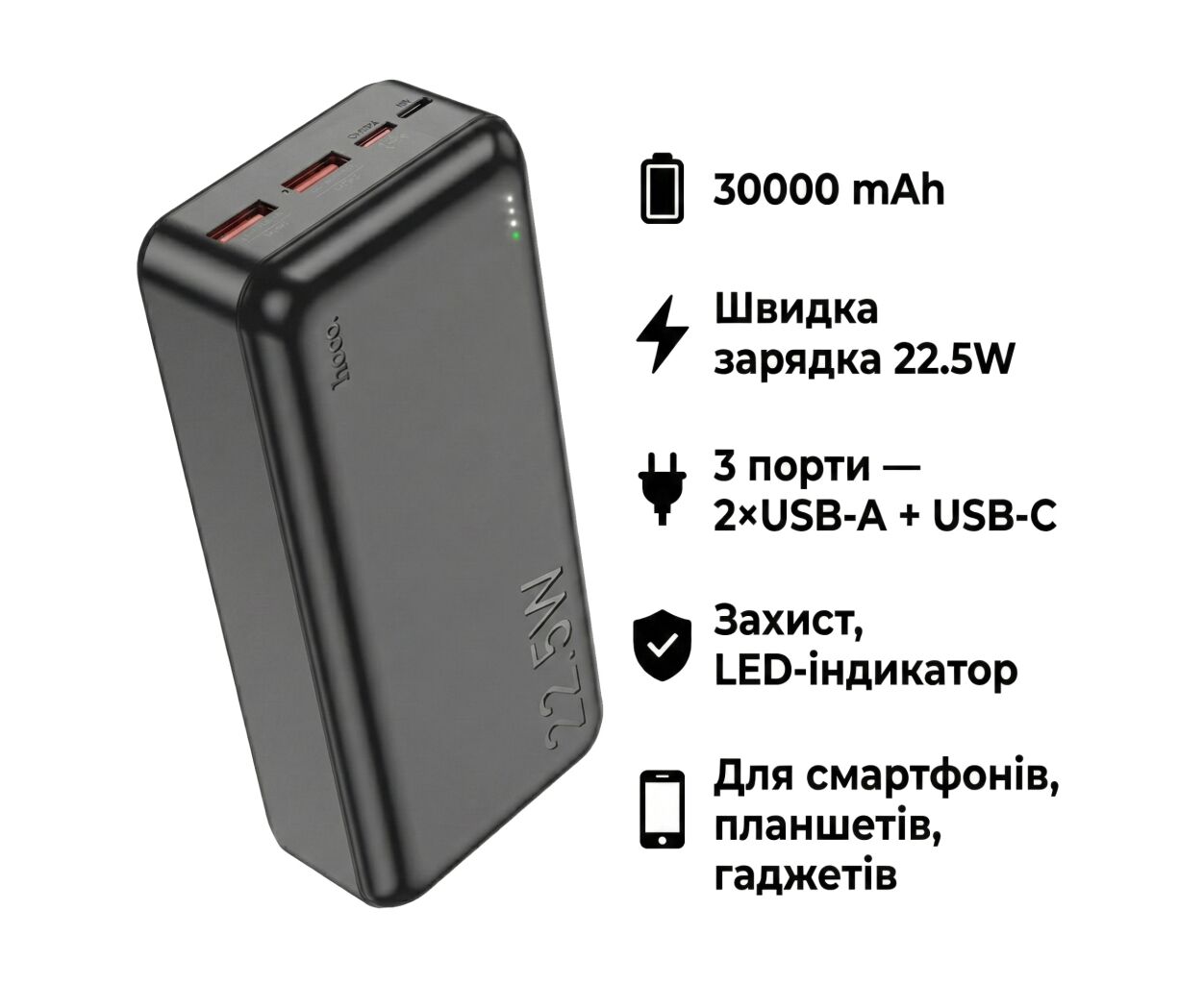 Характеристики Батарея универсальная HOCO 30000mAh Astute 22.5W PD QC Black (J101B / 714732)