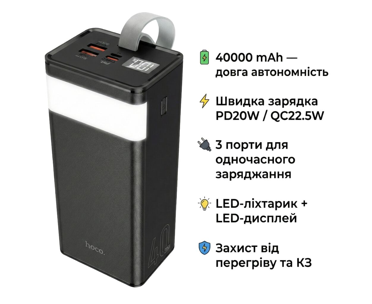 Power Bank Hoco J86 Powermaster PD20W+QC+LCD+Lamp (40000 mAh) Black – это мощный повербанк с поддержкой быстрой зарядки, созданный для максимального комфорта там, где нет доступа к электросети. Подходит для смартфонов, планшетов, роутеров, камер, фонарей и другой портативной техники.
