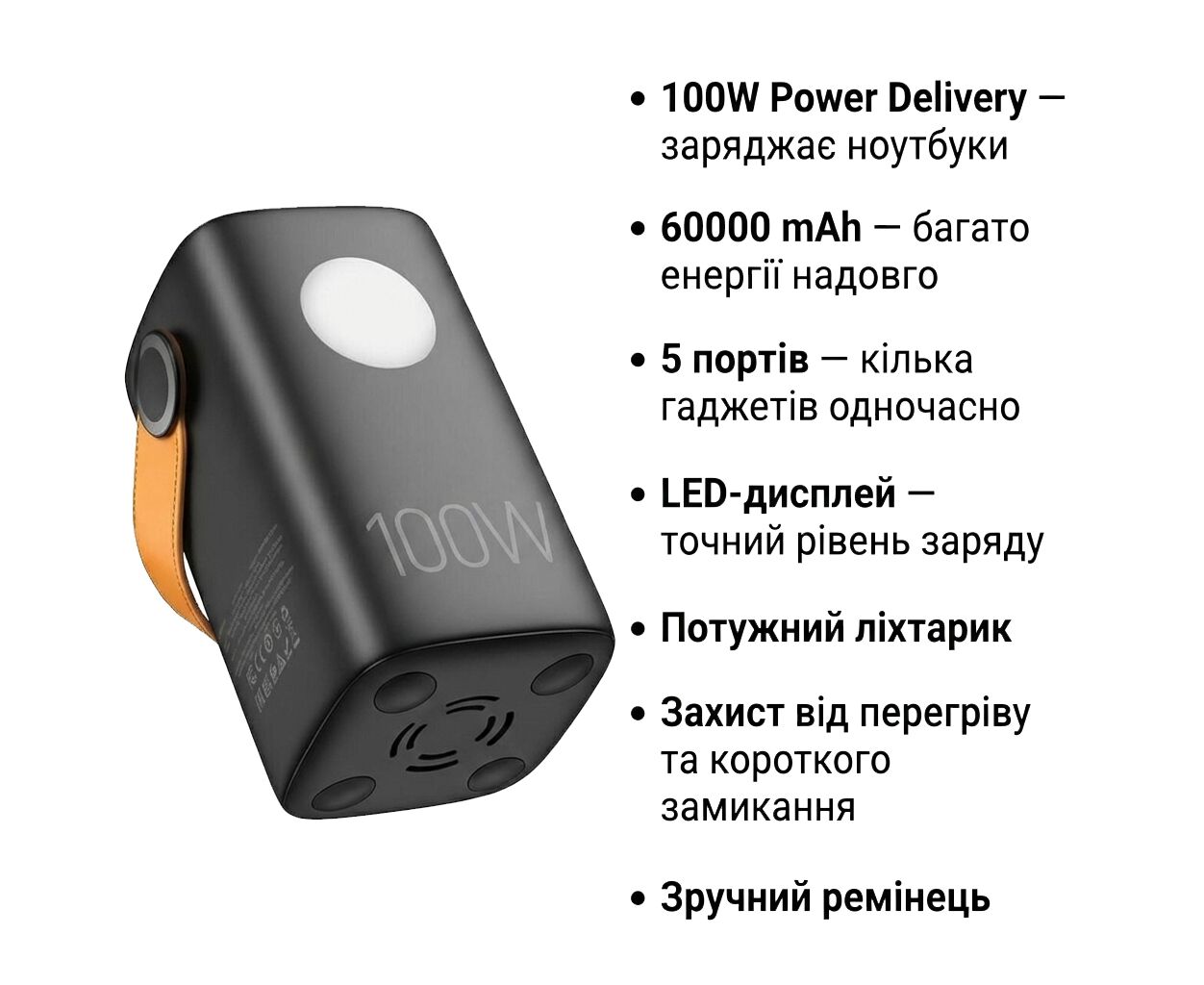 Пять портов позволяют подключать несколько устройств одновременно — это идеальное решение для путешествий, работы вне офиса, кемпинга или аварийных ситуаций. Прочный корпус с ABS+PC обеспечивает надежность и выносливость, а встроенный фонарик и удобный ремешок делают повербанк практичным в использовании в любом месте.