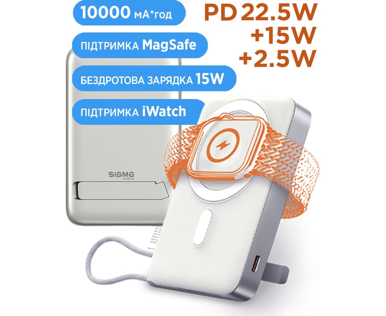 Описание Батарея универсальная Sigma X-power SI10A8QL-MAG silver 10000mAh, Magnetic wireless 15W, charge iWatch, PD+QC, 22,5W max (4827798161012)