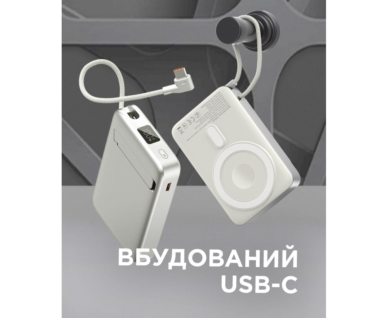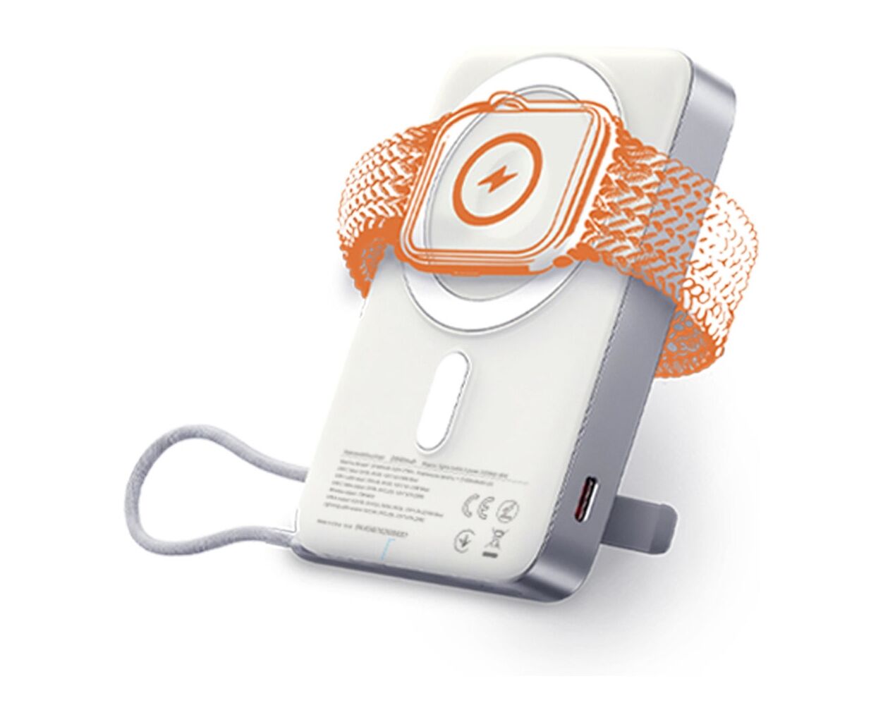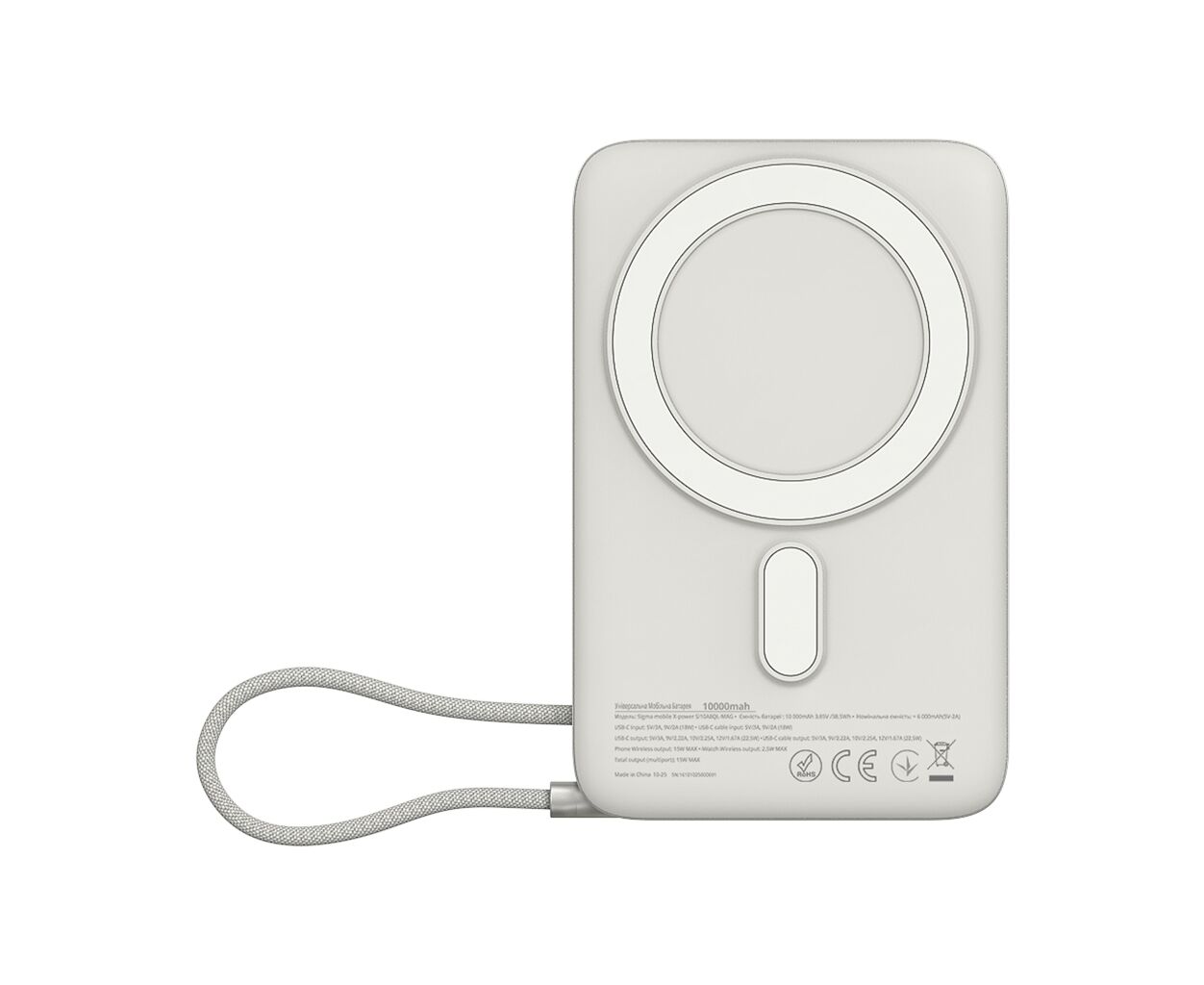 Ёмкость - 10000 mAh, электрохимическая система - Li-pol, Источник заряда батареи - сеть 220 В, интерфейсы подключения (выход) - USB Type-C, Wireless Charger, выходной ток - 3 A, 2.22 A, 1.67 A, 2.25 A, размер - 107.5 x 69 x 20 мм, материал корпуса - пластик, вес - 204 г, Цвет - белый