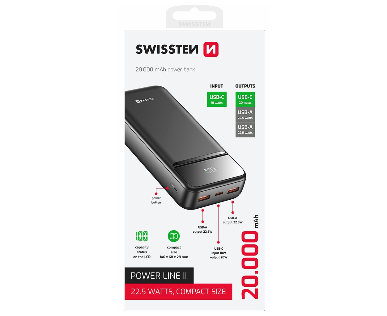 Описание Батарея универсальная SWISSTEN 20000mAh POWER LINE II 22.5W PD QC Black (8595217490628)