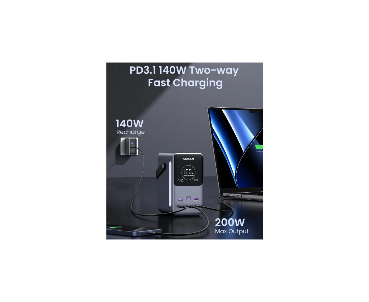 Универсальная мобильная батарея емкостью 48000 мА*ч Ugreen 48000mAh 300W PB770 поможет быстро и безопасно зарядить MacBook Pro, iPhone, Nintendo Switch, аккумуляторы камер, настольные лампы, небольшие вентиляторы и другие USB-устройства.