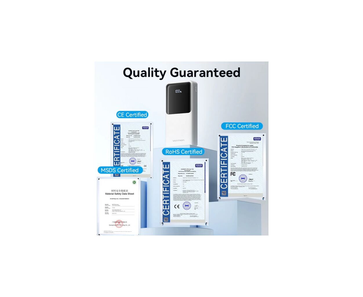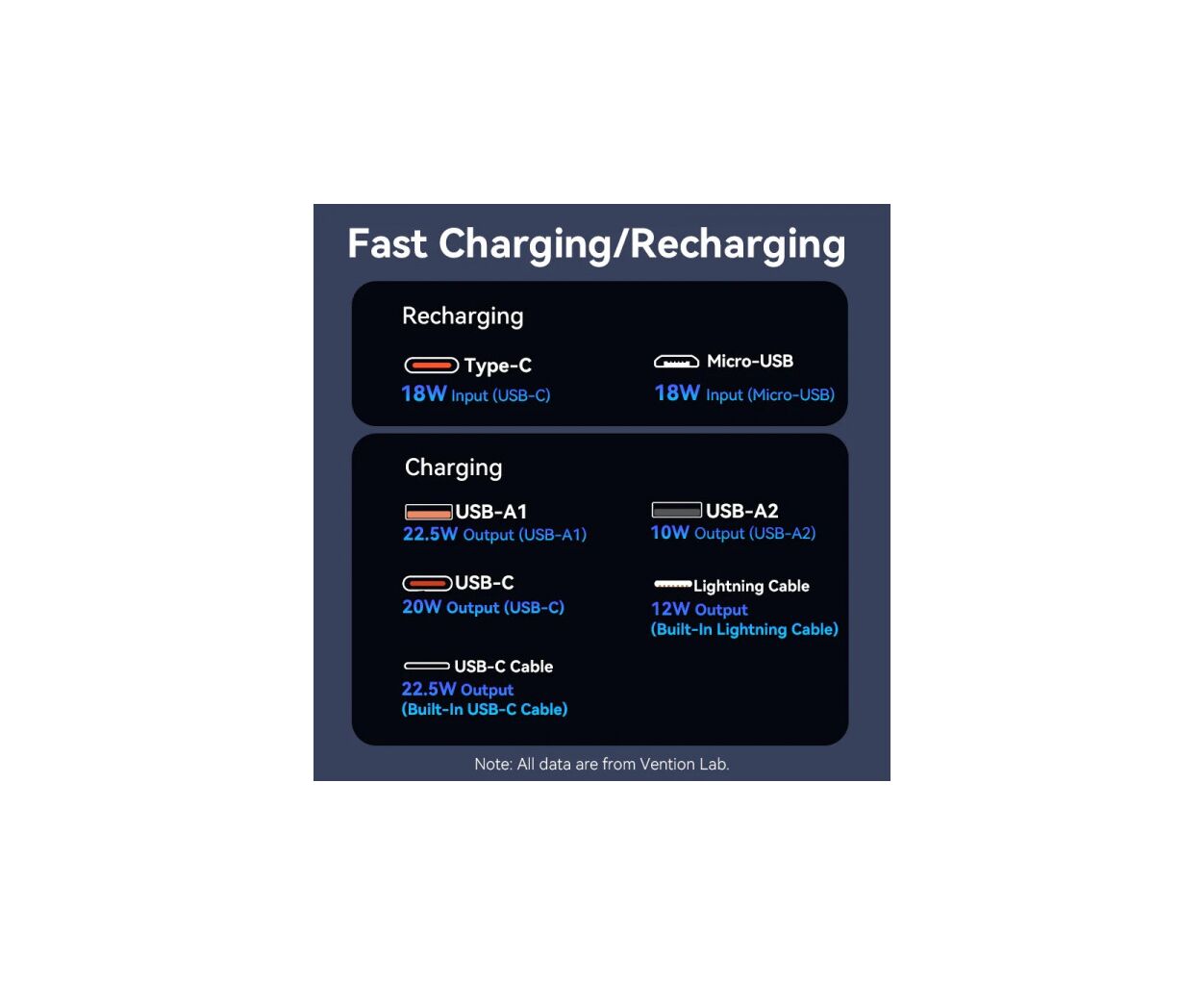 Описание Батарея универсальная Vention 20000mAh 22.5W 3A, PD, QC/3.0, Built-in USB-C+Lightning Cables, White (FHPW0)