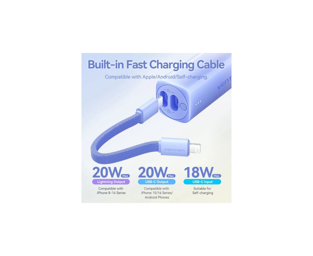 Характеристики Батарея универсальная VENTION 5000mAh 20W PD, USB-C In/Out, Lightning In/Out, with cable, Gradient Yellow (FHWY0)
