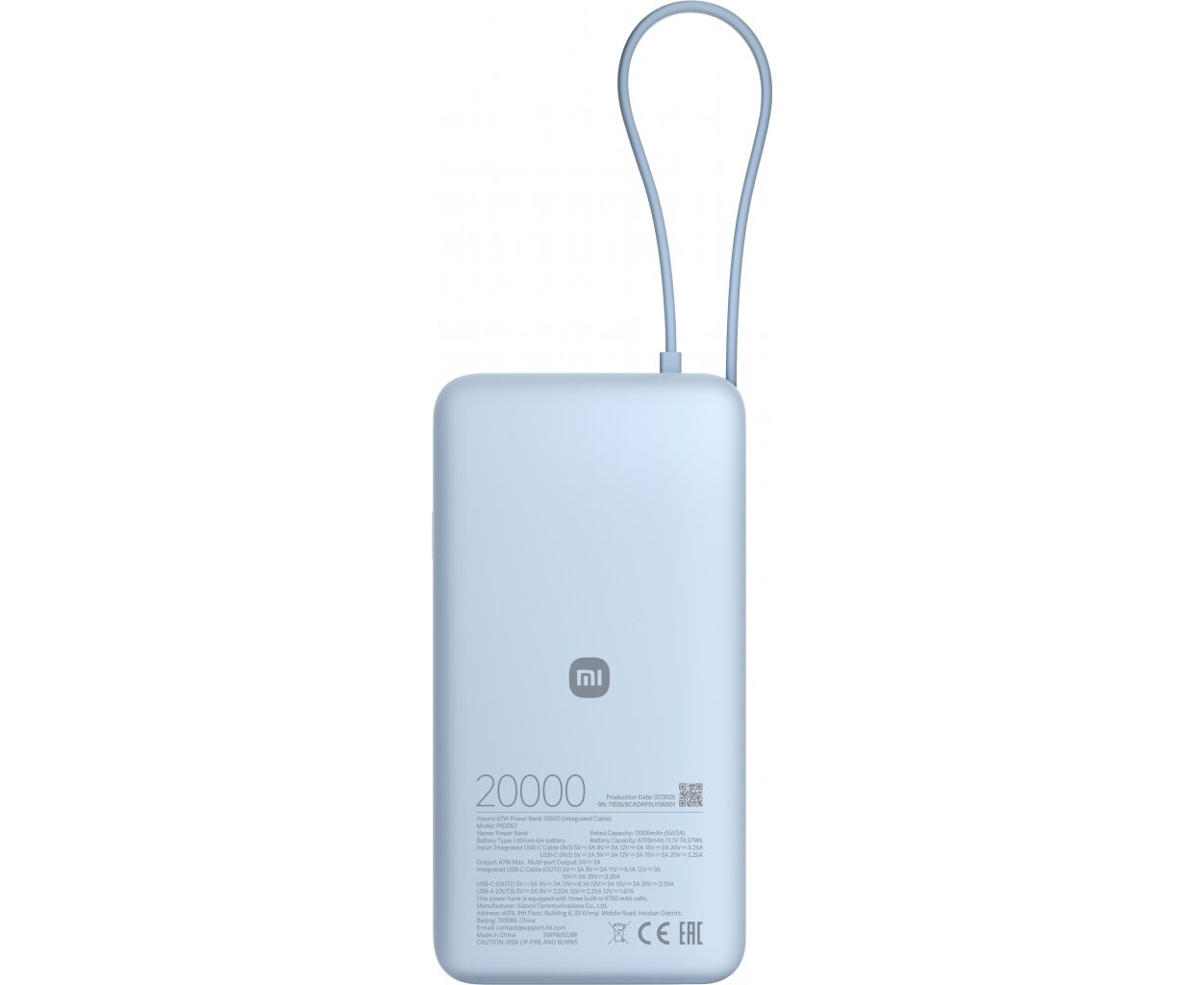Описание Батарея универсальная Xiaomi 20000mAh 67W Integrated Cable Ice Blue (BHR08O8GL)