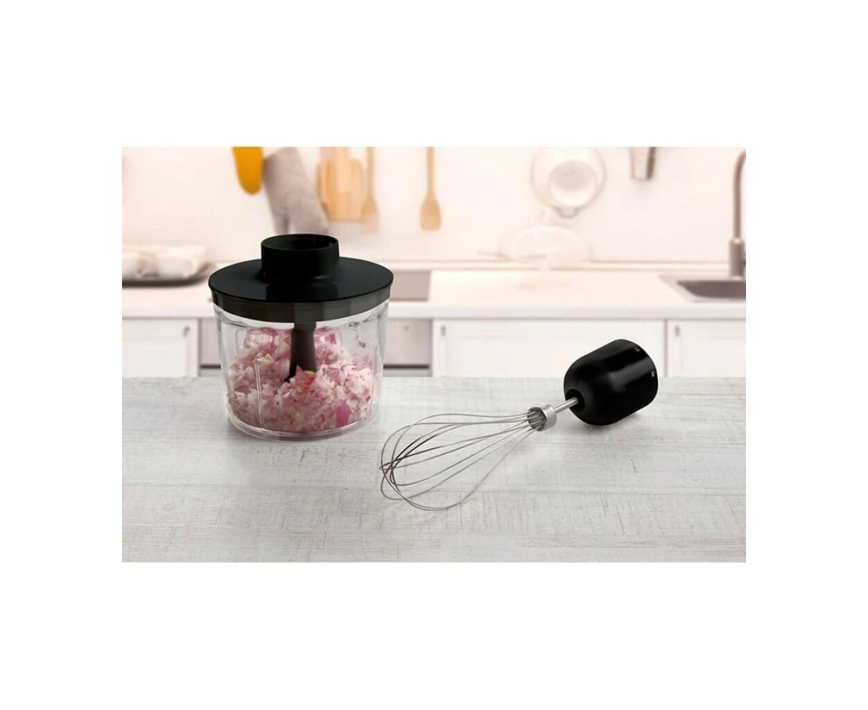 Эта модель снабжена большим набором дополнительных аксессуаров. С помощью смесительной насадки из нержавеющей стали можно легко приготовить идеальные пюре, соусы, смузи, супы и т.д. Насадка для взбивания крепится одним движением. Это удобно, когда нужно взбить яйца или сливки. Измельчитель с чашей объемом 500 мл эффективно измельчает жесткие продукты на мелкие кусочки.