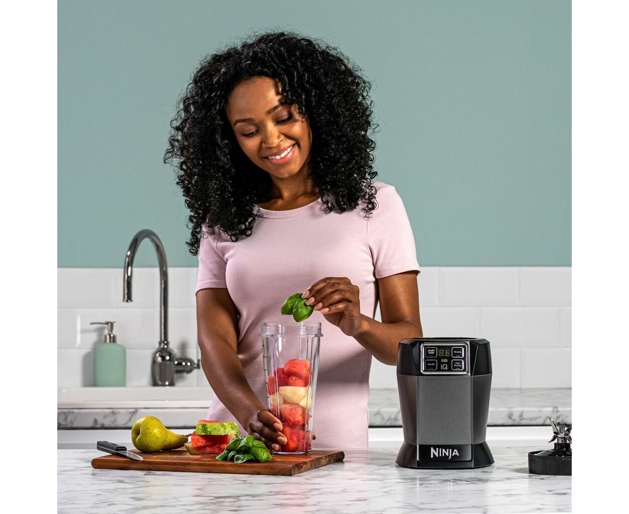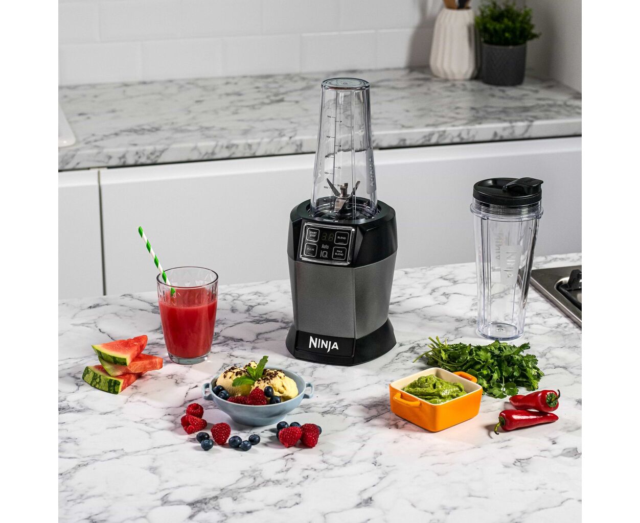 Ninja BN495EU также оснащен дополнительными удобствами, такими как две чаши с крышками с носиком, которые позволяют брать ваши напитки с собой и наслаждаться ими в любом месте и в любое время. Мерная чаша объемом 0.7 л из прочного тритана не содержит опасных для здоровья веществ и позволяет точно дозировать ингредиенты. Кроме того, есть мини-измельчитель объемом 700 мл, который пригодится, когда нужно подготовить меньшее количество продуктов.