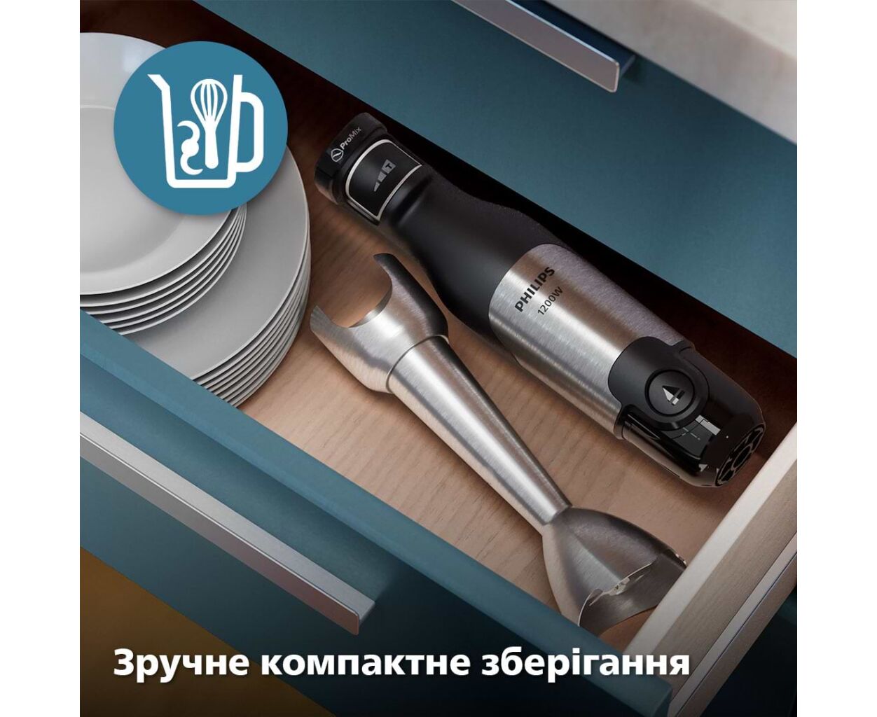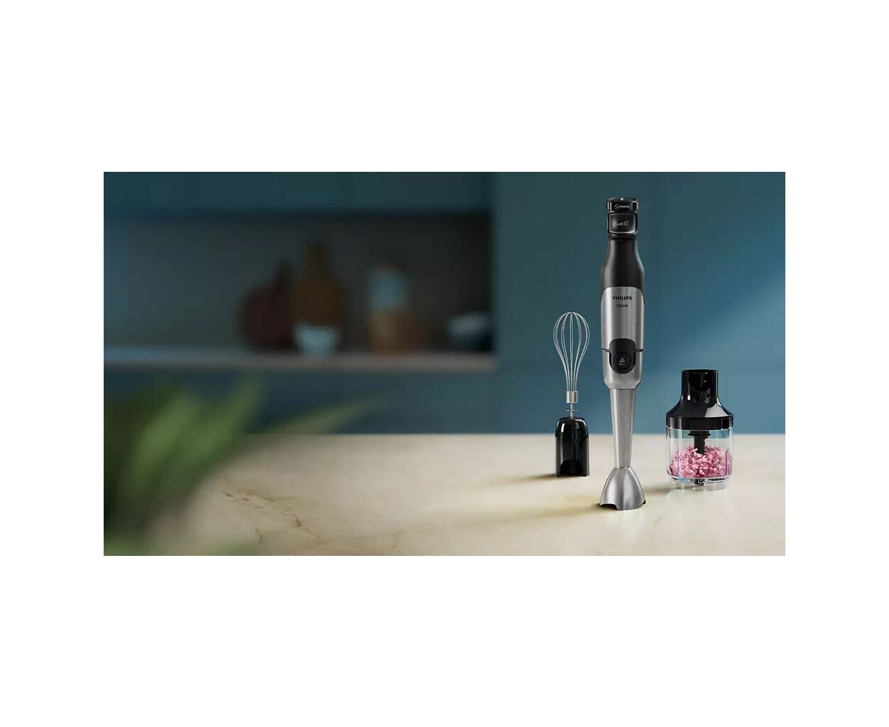 Три режима работы — смешивание, взбивание, измельчение — открывают мастерство в каждом движении. Блендер оснащен насадкой-венчиком для идеального взбивания сливок или приготовления майонеза, в то время как измельчитель с емкостью 500 мл позволяет быстро обрабатывать лук, зелень или орехи. Удобный чоппер добавляет комфорта при нарезке овощей.