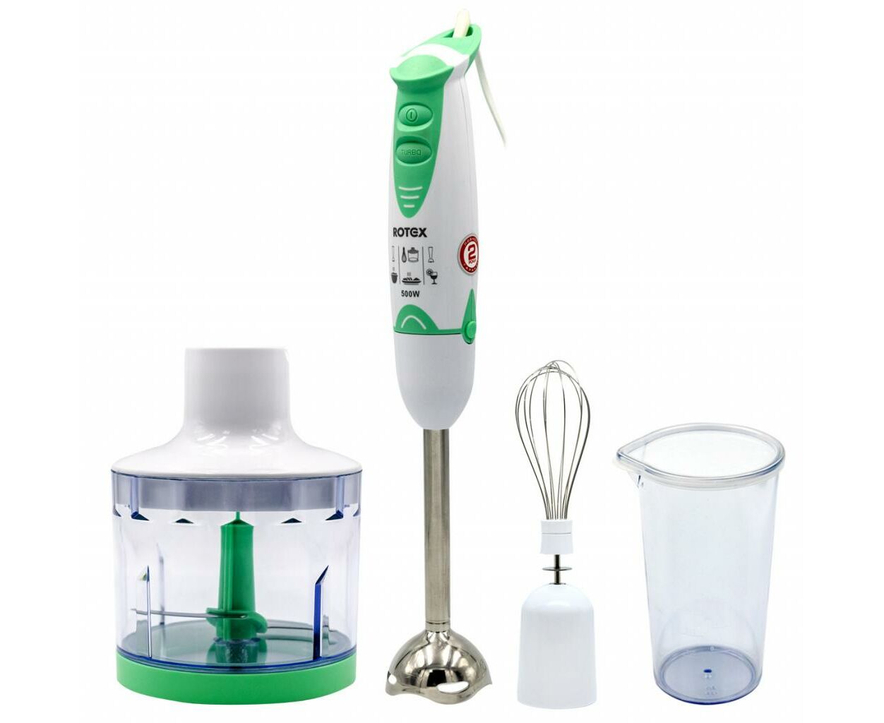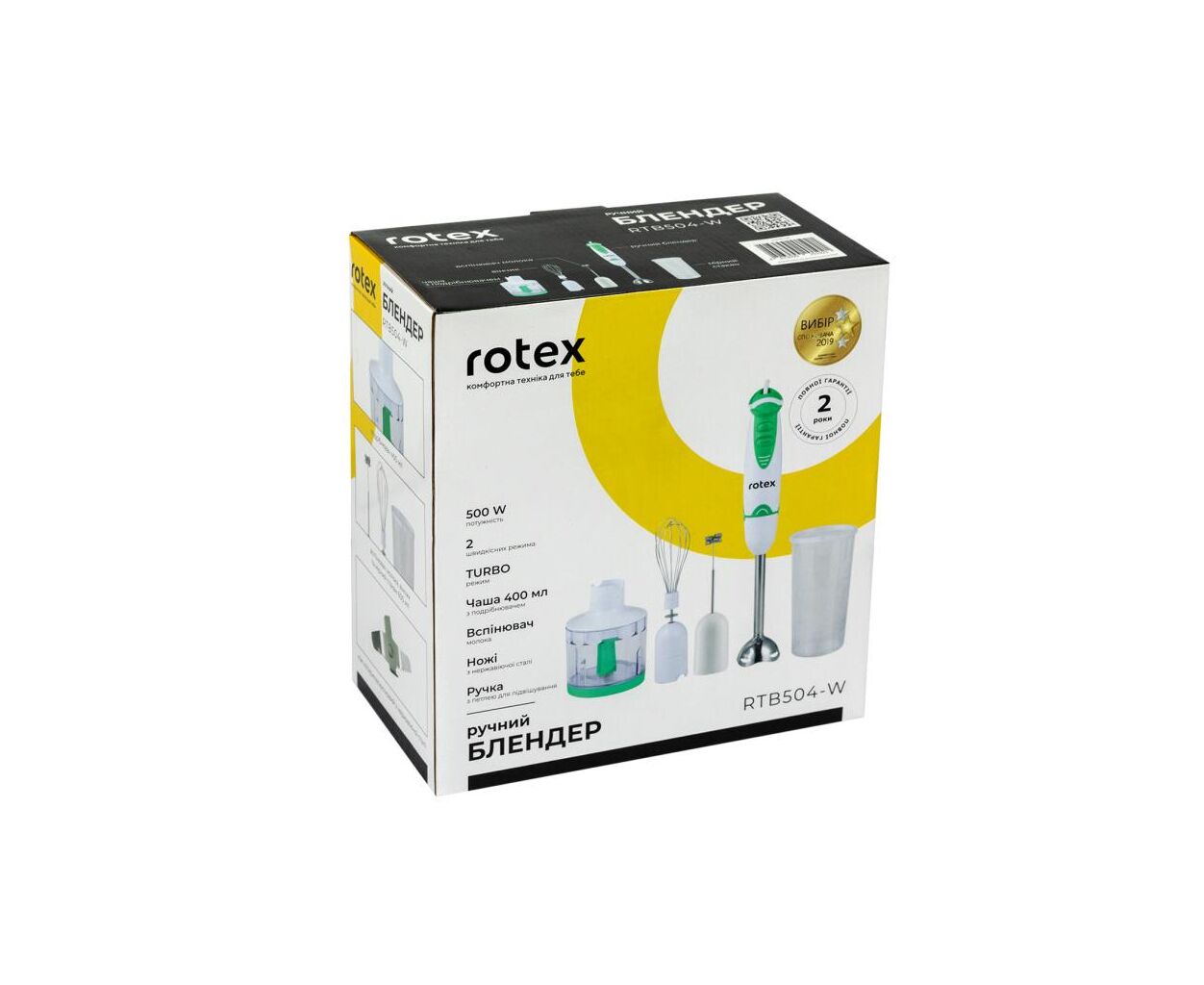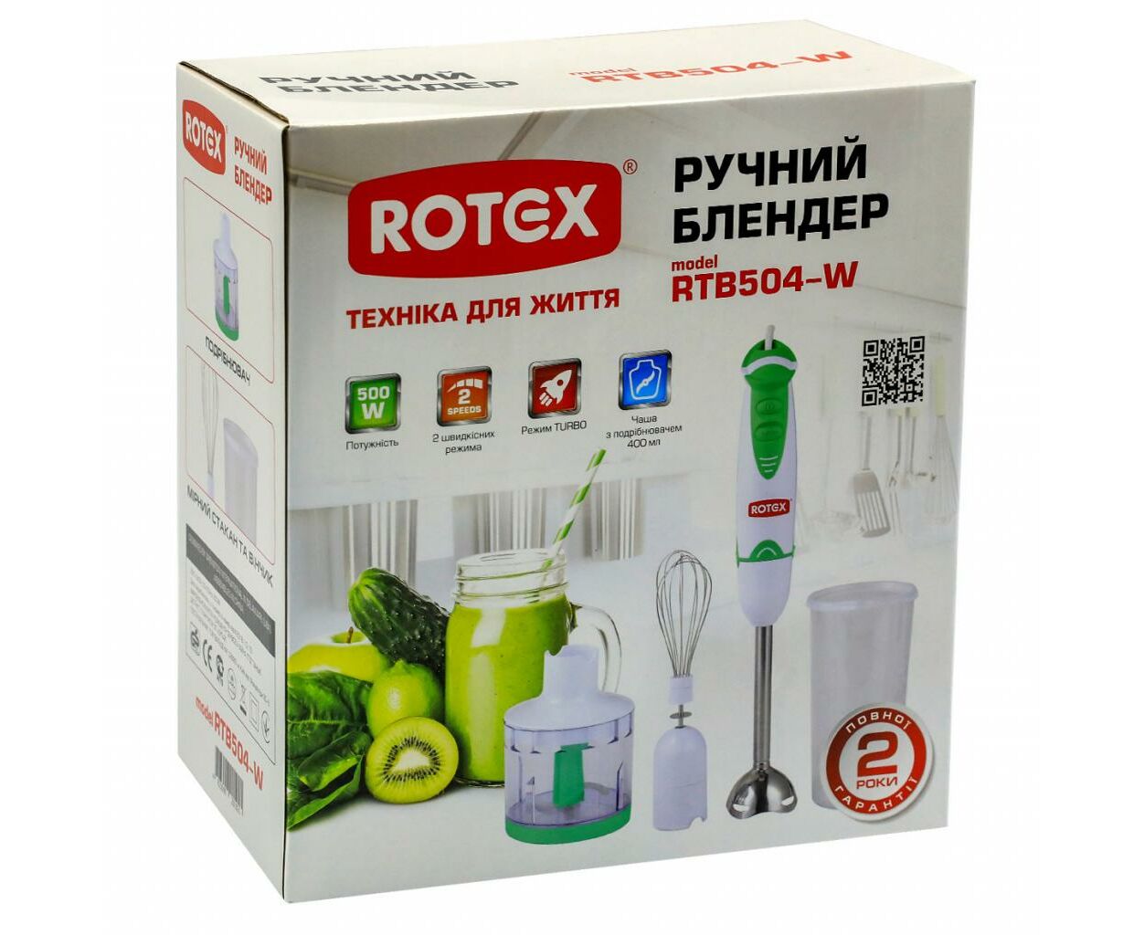 Rotex RTB504-W оснащен не только стандартной насадкой-блендером, но и практичным венчиком для взбивания и измельчителем объемом 400 мл. Это позволяет расширить спектр применения блендера, включая взбивание кремовых десертов, сливок и яичных белков. А переключение между двумя скоростями и рабочей частотой 13000 об/мин предоставит вам возможность адаптировать процесс в соответствии с консистенцией и типом продуктов.