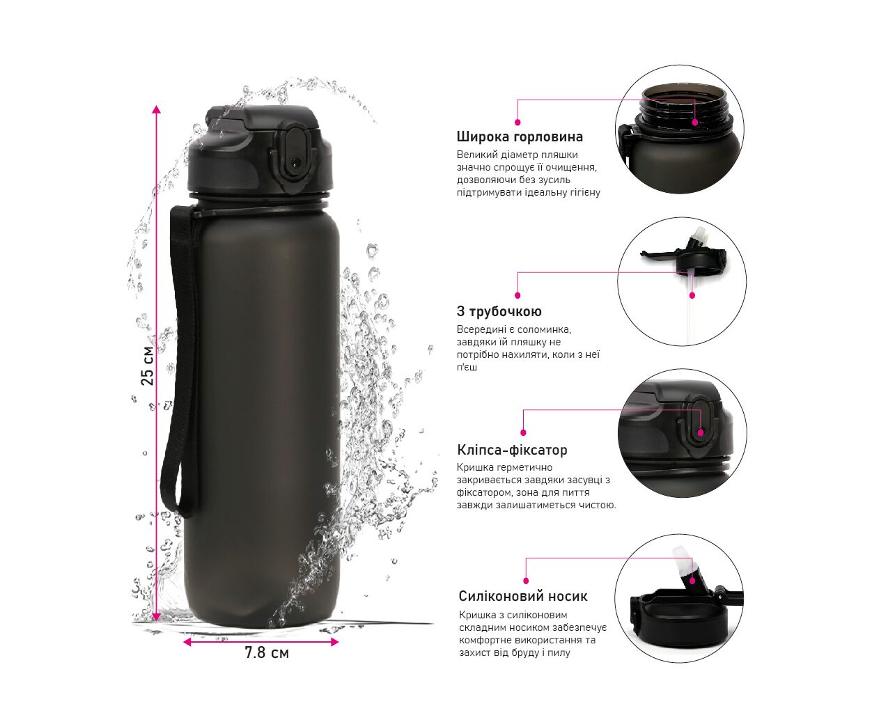 Герметичная пластиковая крышка с складным силиконовым носиком обеспечивает комфортное использование и защиту от грязи и пыли. В то же время система открывания очень надежна за счет клипсы-фиксатора. Крепкий ремешок позволяет легко переносить бутылку, держа ее под рукой. Большой диаметр бутылки значительно упрощает ее очистку, позволяя без труда поддерживать идеальную гигиену.