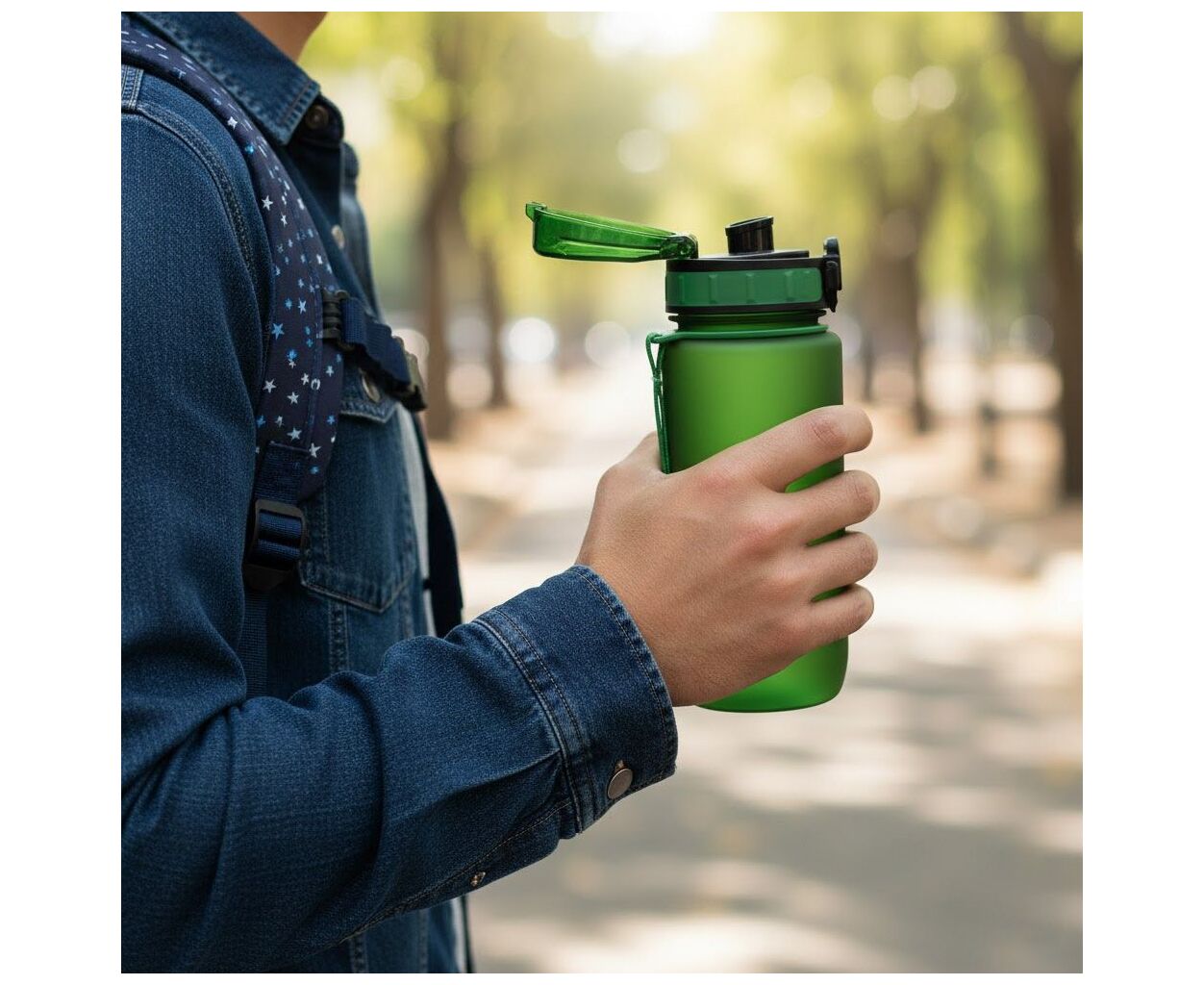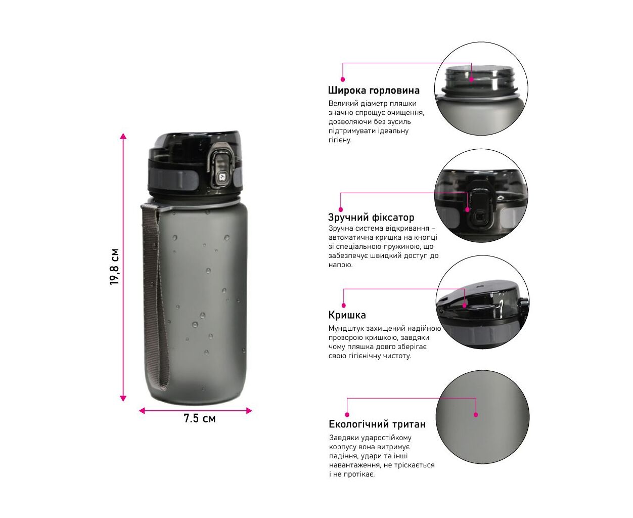 Крышка оснащена кнопкой с фиксатором, что предотвращает случайное открытие при транспортировке. Пластиковый носик с откидной защитной крышкой обеспечивает гигиеничность и удобство во время использования. Матовое покрытие корпуса обеспечивает приятное тактильное чувство и стойкость к царапинам. Оснащена прочным встроенным нейлоновым ремешком для комфортного ношения. Благодаря широкому горлышку бутылка легко моется и быстро наполняется.