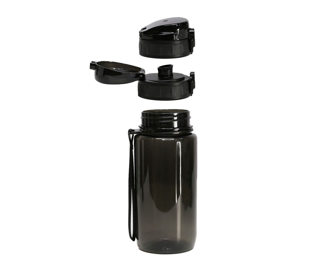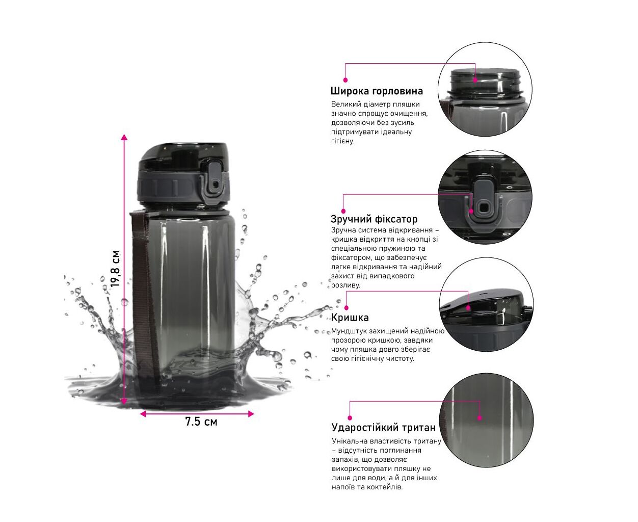 Крышка оснащена кнопкой с фиксатором и пружиной, что предотвращает случайное открывание и обеспечивает надежную защиту от протечки. Пластиковый носик с откидной защитной крышкой обеспечивает гигиеничность и удобство при использовании в спортзале, офисе или на улице. Вставки по бокам крышки обеспечивают комфортное открывание даже мокрыми руками. Благодаря широкому горлышку бутылка легко моется и быстро наполняется.