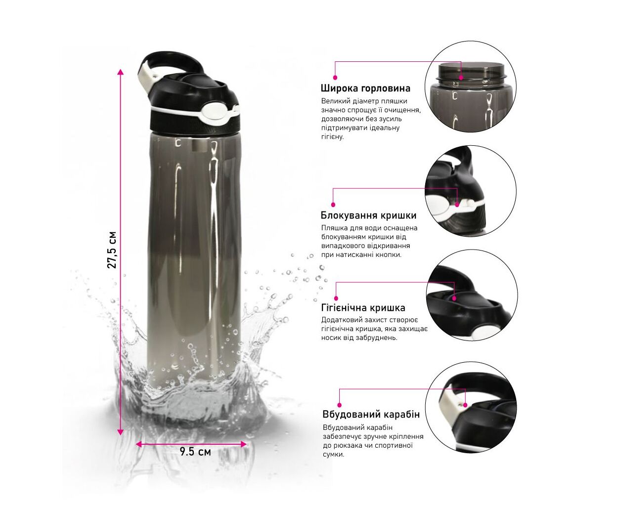 Бутылка оснащена кнопкой блокировки и крышкой, защищающей силиконовый носик. Внутренняя трубочка обеспечивает удобное питье без наклона. Широкое горлышко упрощает очистку и наполнение. Карабин позволяет крепить бутылку к рюкзаку или спортивной сумке.