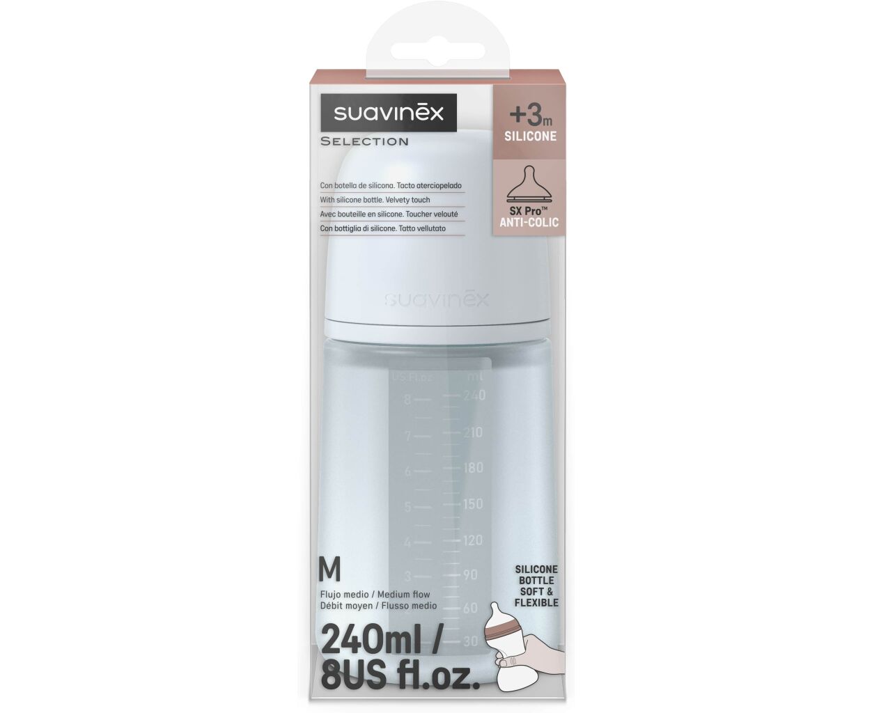 Бутылочка для кормления Suavinex Colour Essence, 240 мл, силіконова, 240 мл, фізіологічна соска повільний потік, , світло-блакитн (308653)