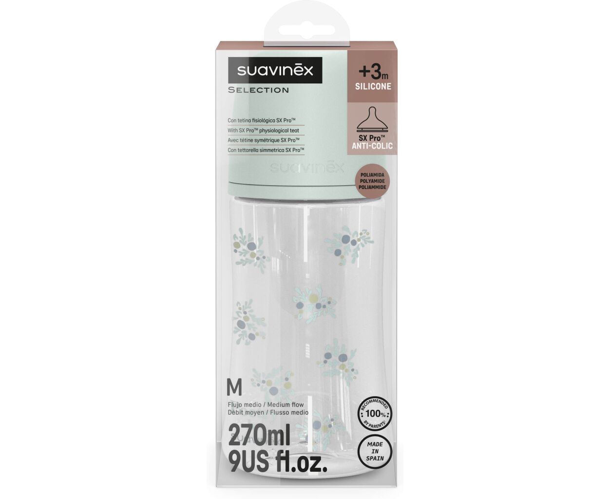 Характеристики Бутылочка для кормления Suavinex Poetry, 270 мл, фізіологічна соска середній потік, м'ятна (308970)