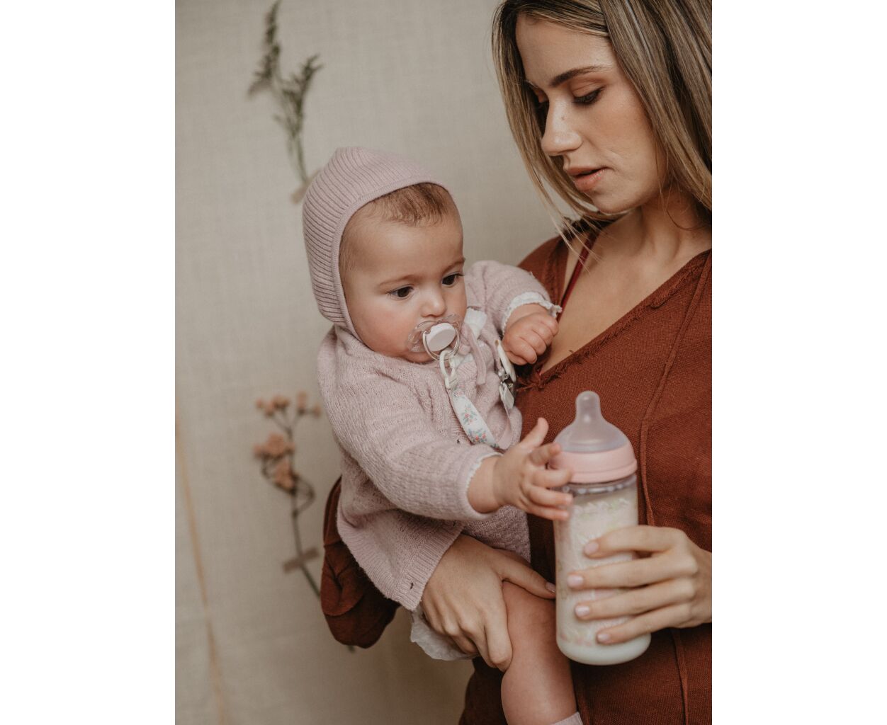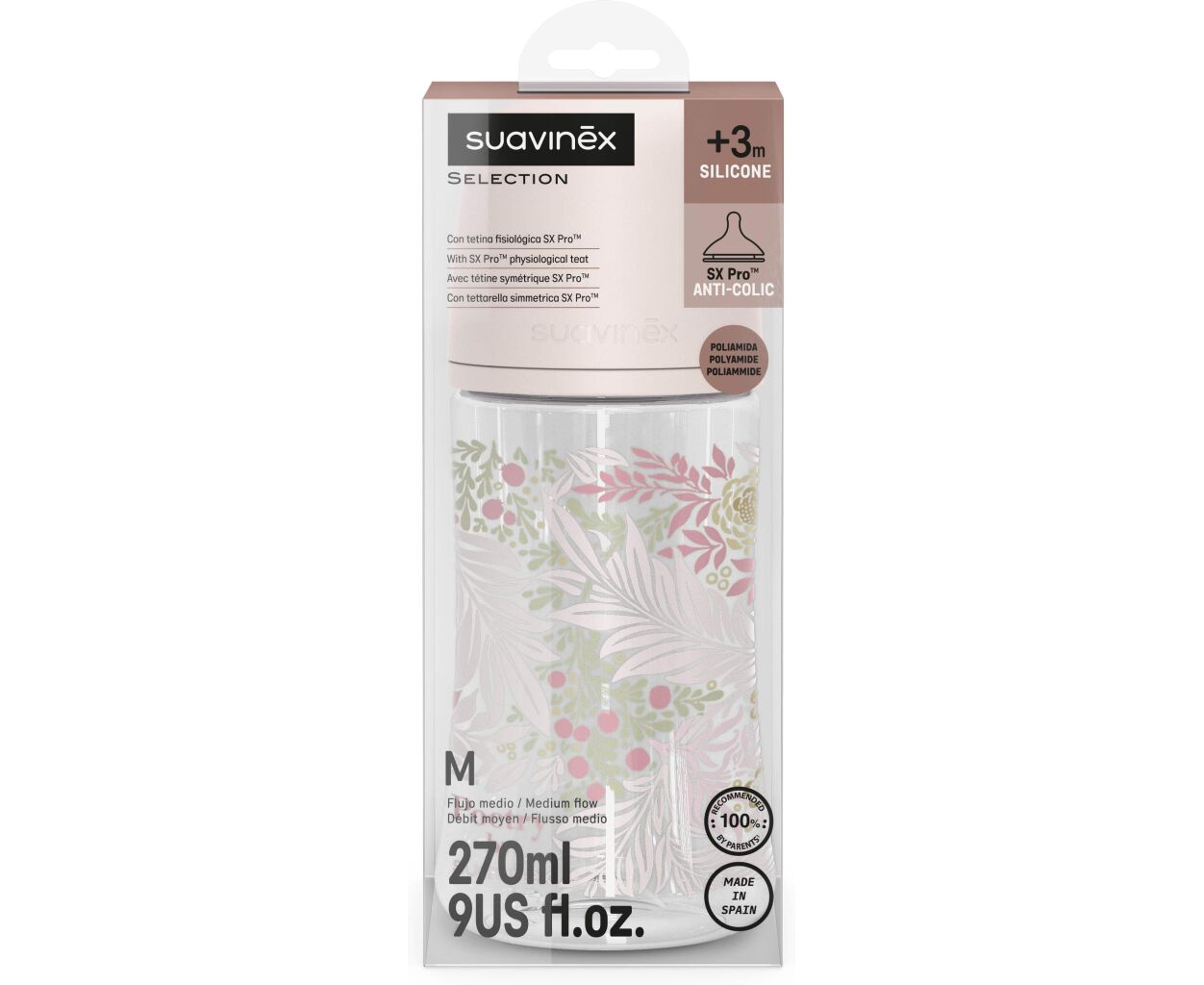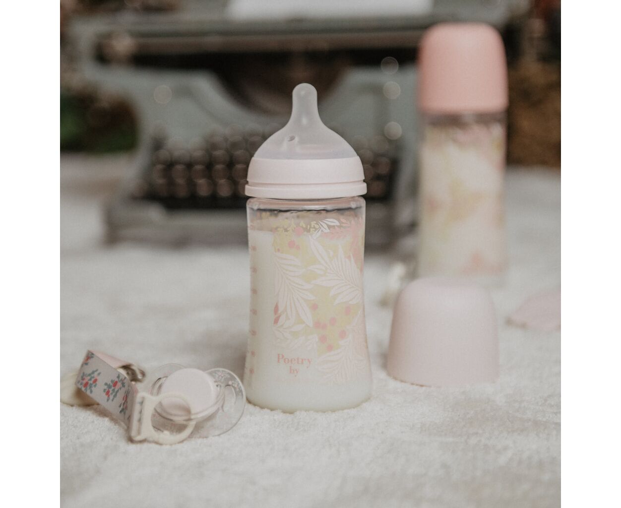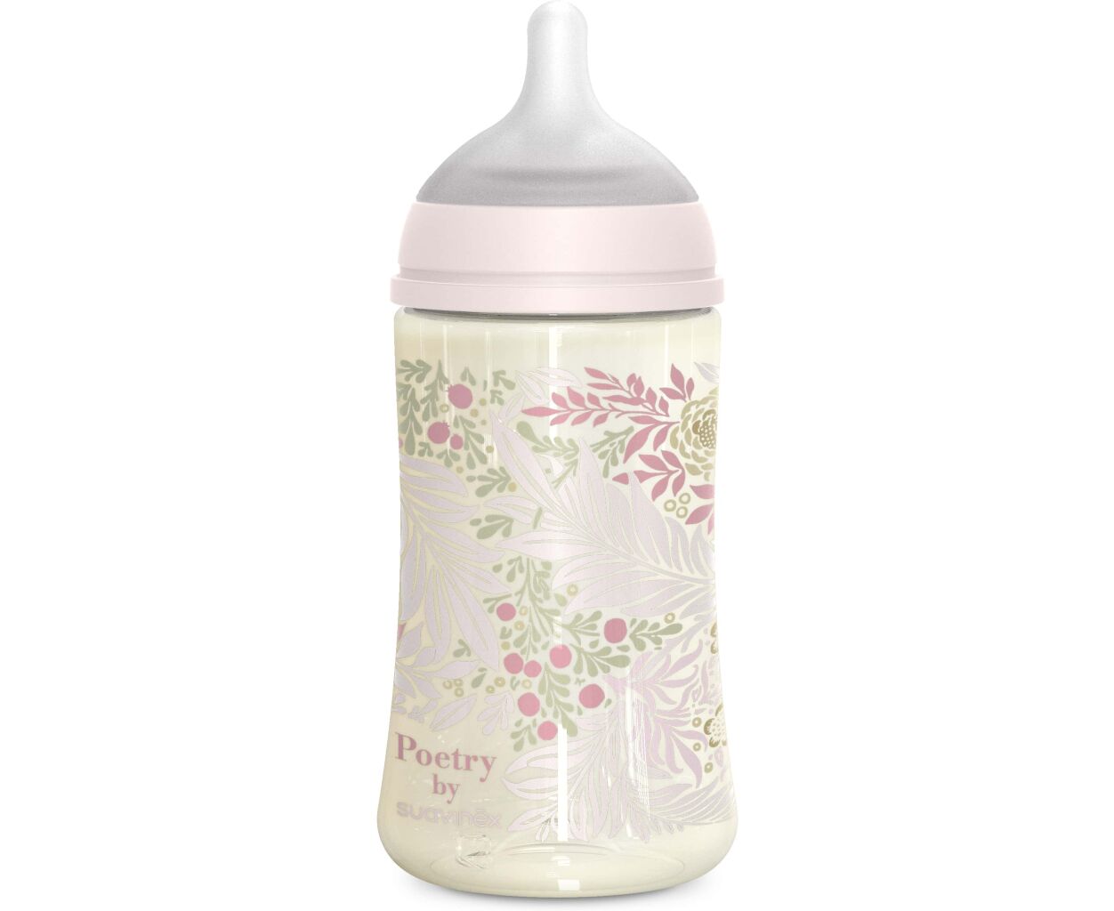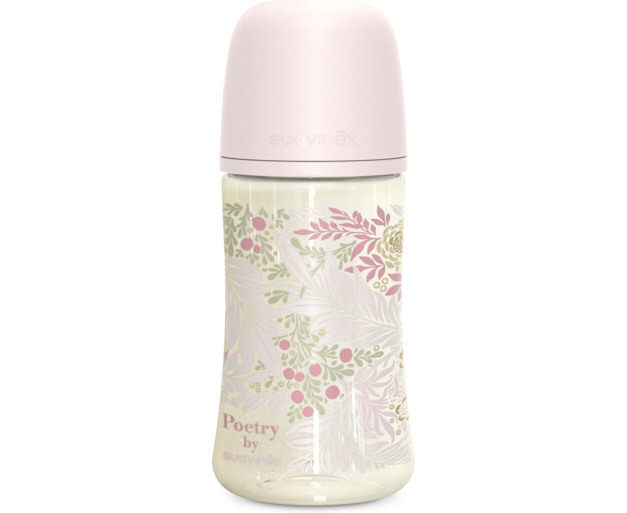 Описание Бутылочка для кормления Suavinex Poetry, 270 мл, фізіологічна соска середній потік, світло-рожева (308969)