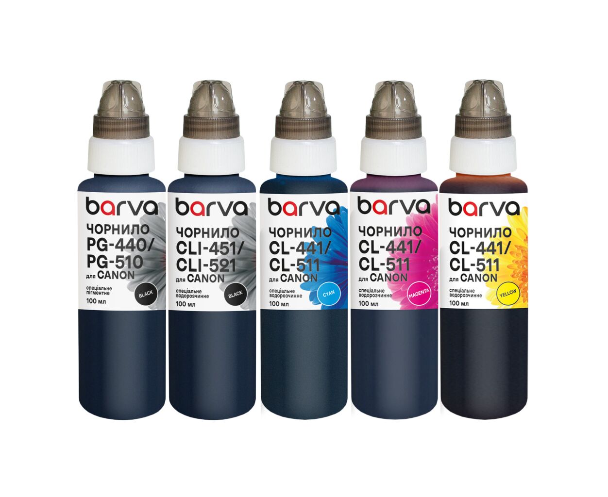 Тип - совместимый, тип чернил - пигментные, водорастворимые, совместимость с устройствами бренда - Canon, Цвет - набор (set), емкость - 5 х 100 мл
