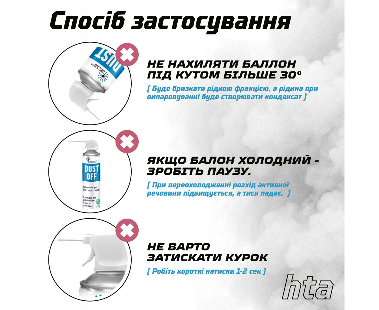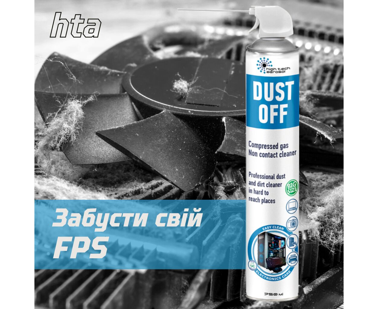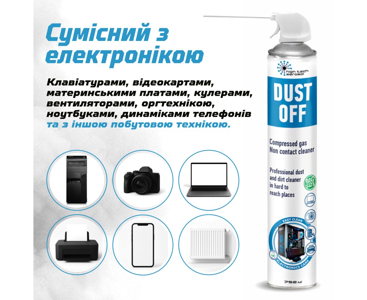 HTA DUST OFF быстро и безопасно удаляет пыль и другие загрязнения с чувствительных и труднодоступных мест. Предназначен для очистки ноутбуков, клавиатур, системных блоков, телевизоров, принтеров, телефонов, прецизионного оборудования и другой офисной и домашней техники. Также подходит для чистки предметов в доме, таких как предметы коллекционирования, жалюзи, салон автомобиля, музыкальные инструменты и другие устройства.
