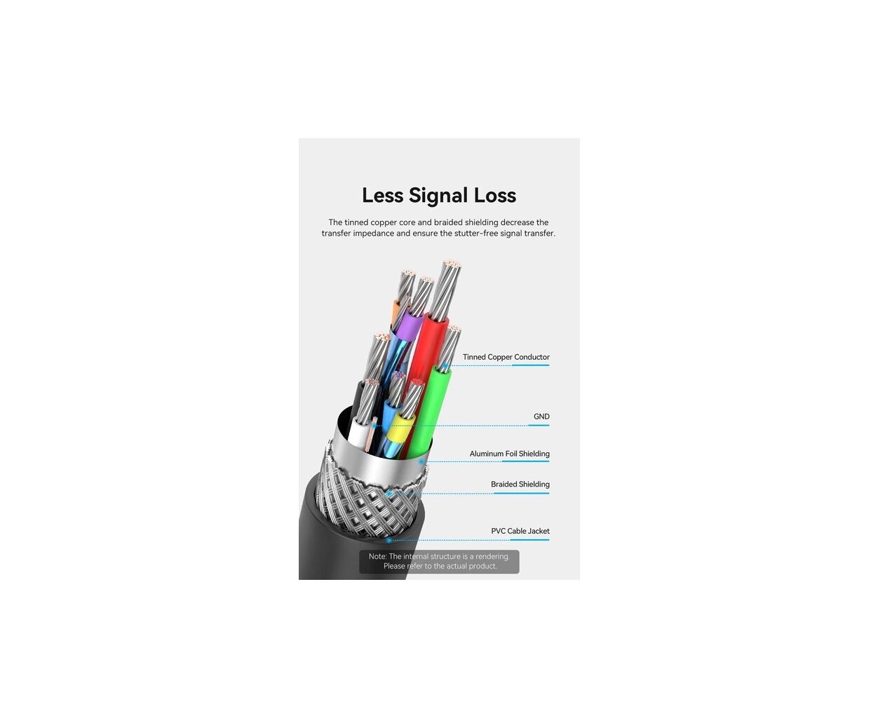 - Многослойное экранирование и качественный проводник: Сердцевина кабеля изготовлена из луженой меди, которая обладает превосходной проводимостью и стойкостью к окислению, что положительно влияет на качество передачи сигнала. Для защиты от электромагнитных помех и радиочастотных шумов используется сложная система экранирования, включающая алюминиевую фольгу, металлическую оплетку и отдельную проволоку заземления. Такая конструкция сводит к минимуму влияние внешних факторов, обеспечивая чистоту сигнала даже в среде с большим количеством электронной техники.