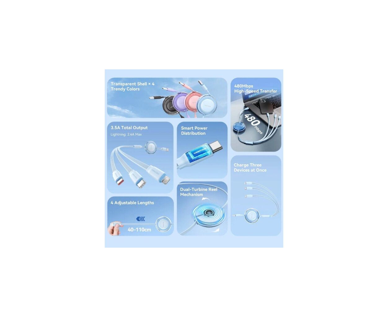 • Тип: USB 2.0 AM → 2× USB-C + Lightning (3-в-1 кабель) ✨