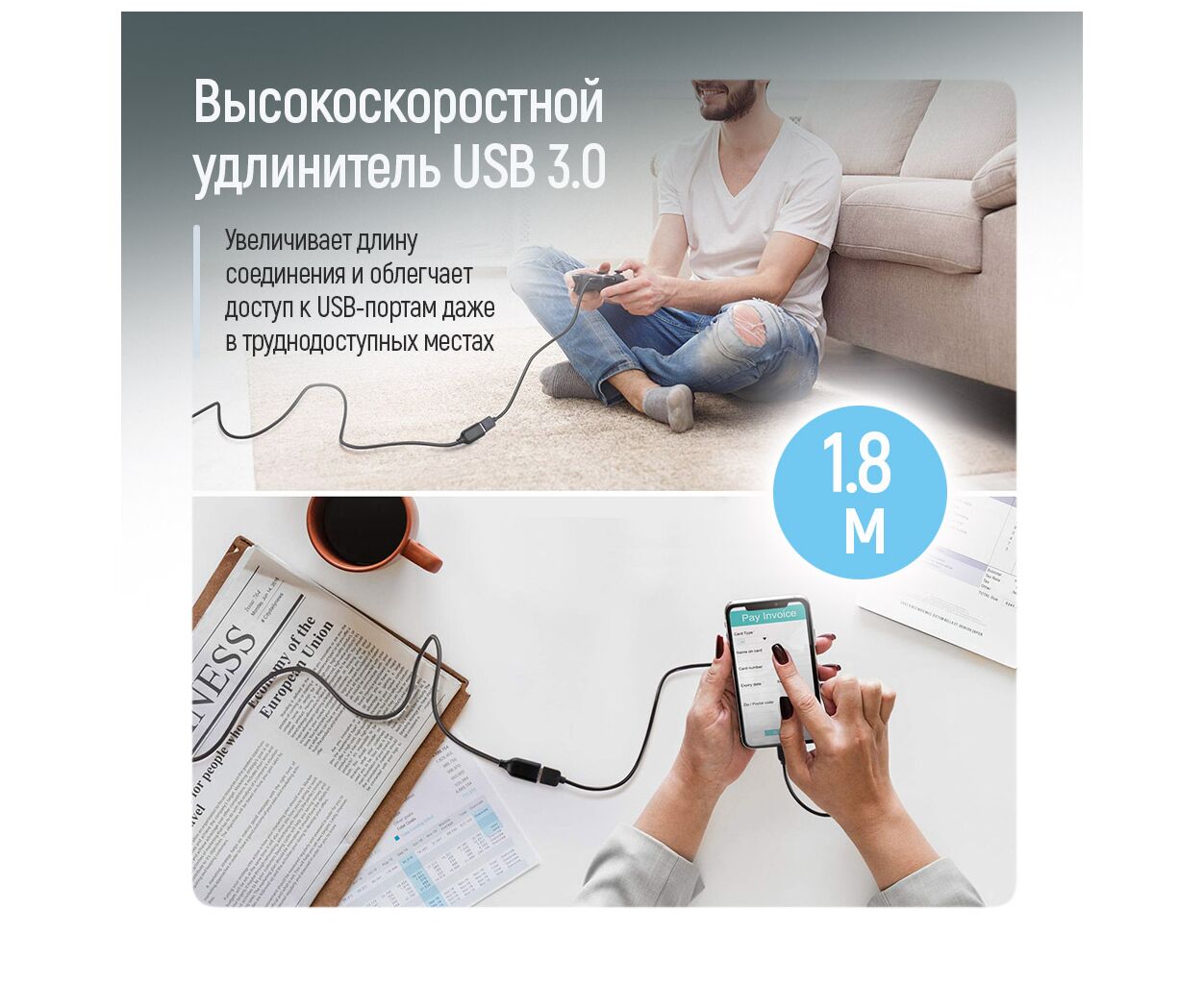 Тип - удлинитель, Тип коннектора 1 - USB 2.0 (AM), Тип коннектора 2 - USB 2.0 (AF), длина - 1.8 м, покрытие: ПВХ, Поддерживает функцию автоматической настройки Plug & Play, поддерживает скорость передачи данных 5 Гбит/с, Цвет - черный
