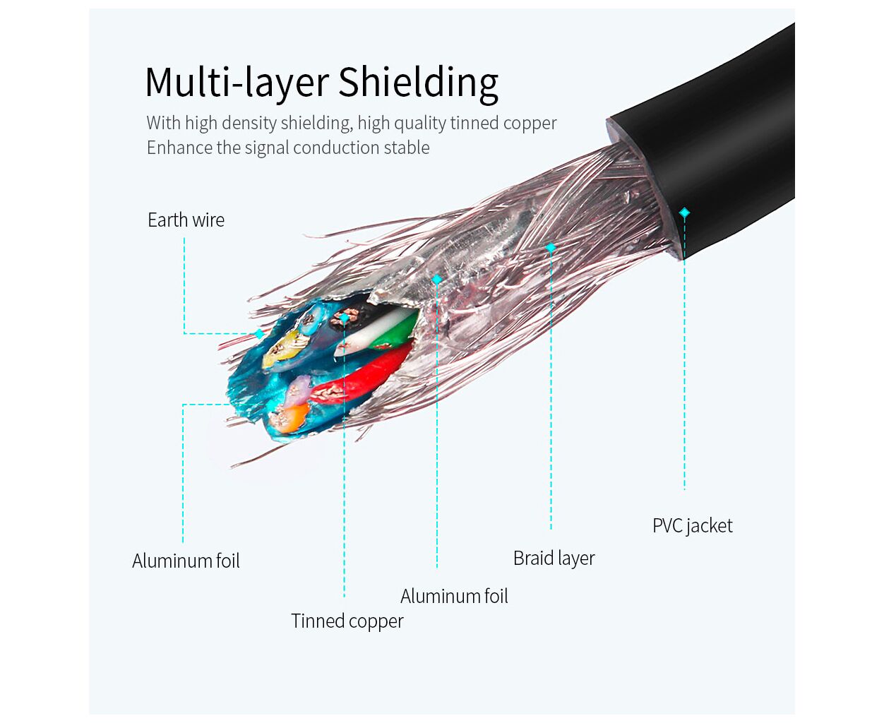 - Многослойное экранирование, высококачественная луженая медь, стабильная проводимость сигнала.