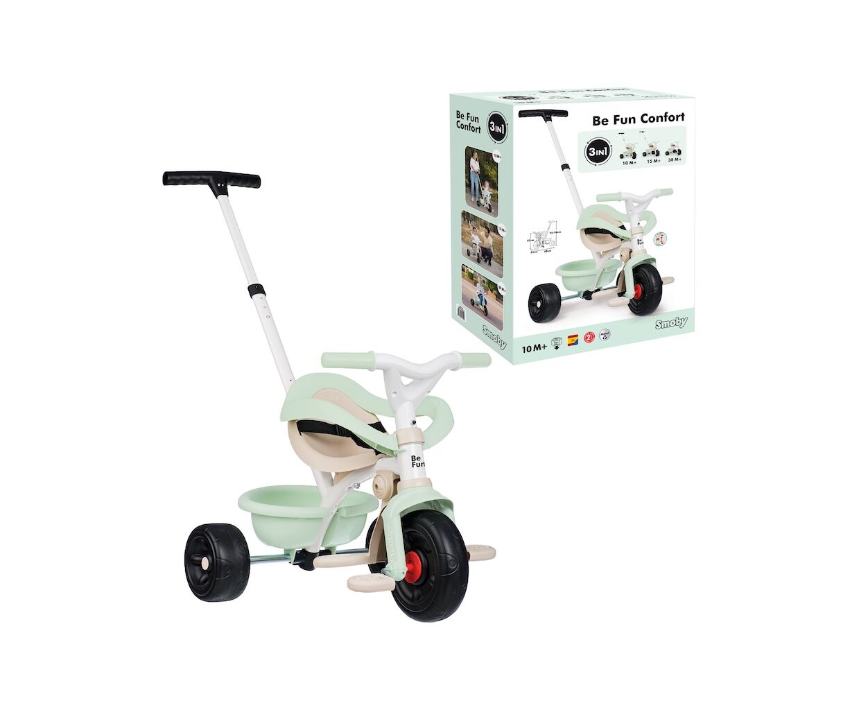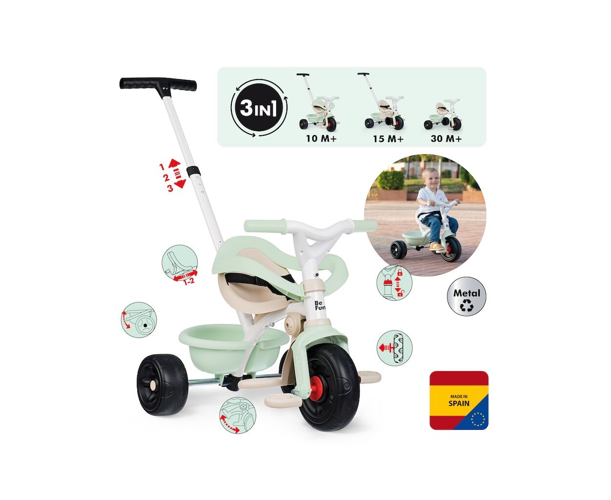 Трехколесный металлический велосипед Smoby toys 3 в 1 Be move Mint растет вместе с ребенком. Подходит для детей от 10 месяцев. Благодаря своей комплектации и функциональности легко превращается в велосипед с максимальным уровнем безопасности и комфорта с родительским управлением в велосипед с самостоятельным управлением ребенком. Теперь не нужно покупать несколько разных транспортных средств!