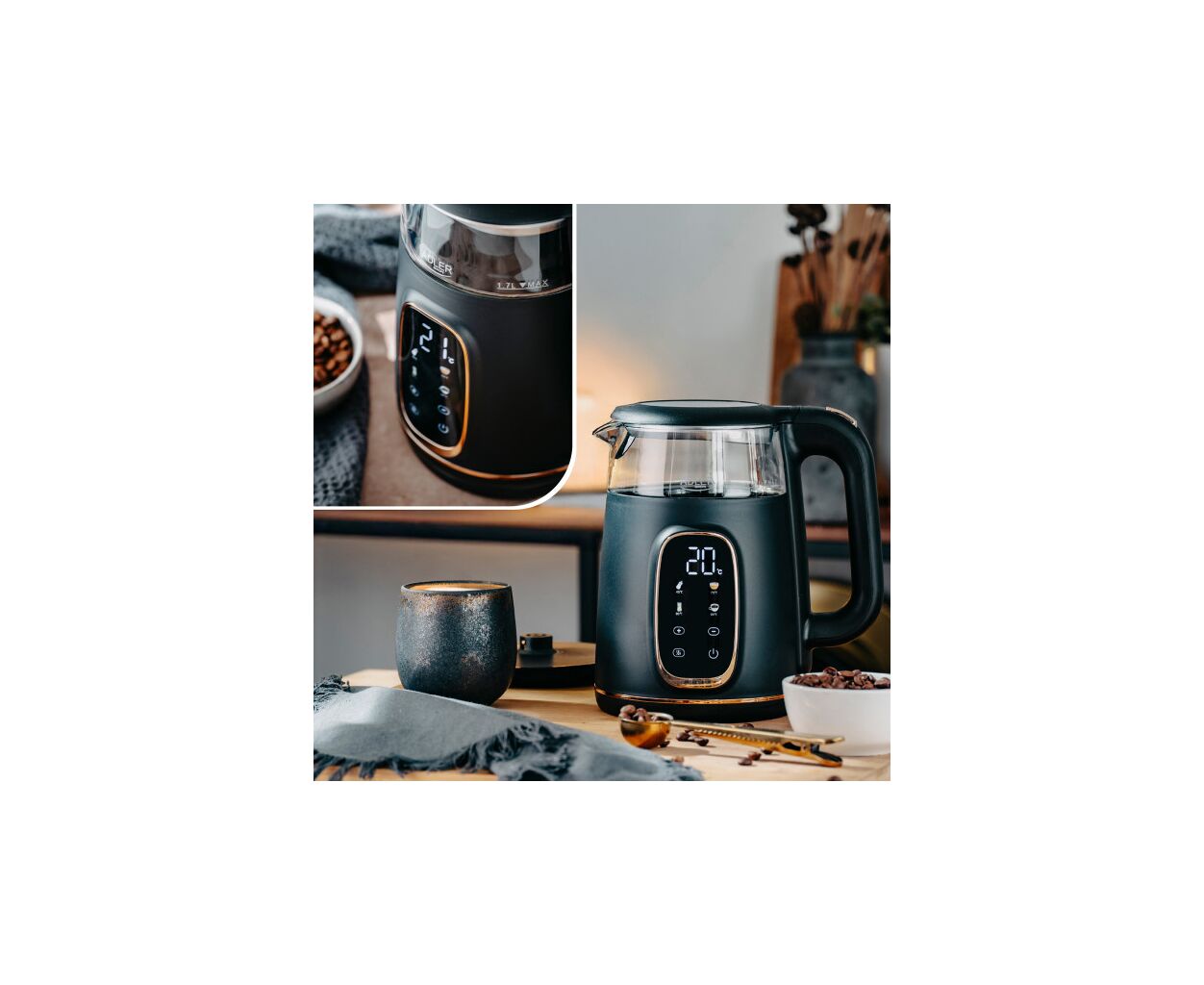Благодаря возможности вращения на 360°, вы сможете удобно использовать чайник с любой стороны, а удобство управления обеспечивает сенсорная панель с цветным дисплеем. Вы можете выбрать среди пяти предварительно установленных температурных режимов — 40°C, 70°C, 80°C, 90°C и 100°C, что идеально подходит для приготовления различных видов чая или других напитков.