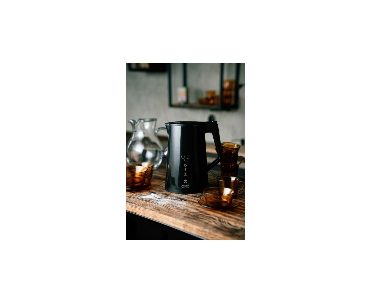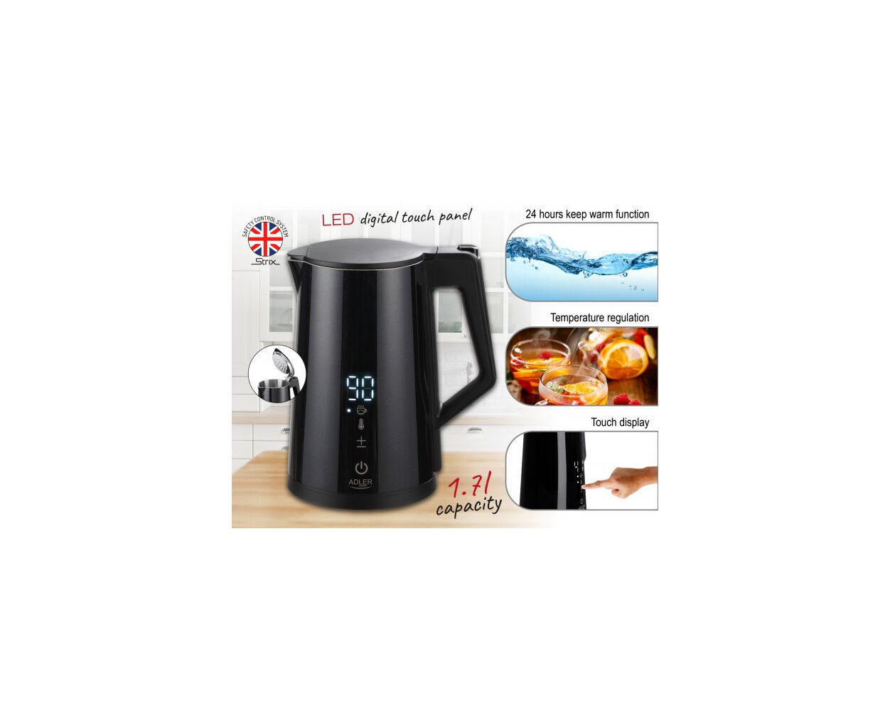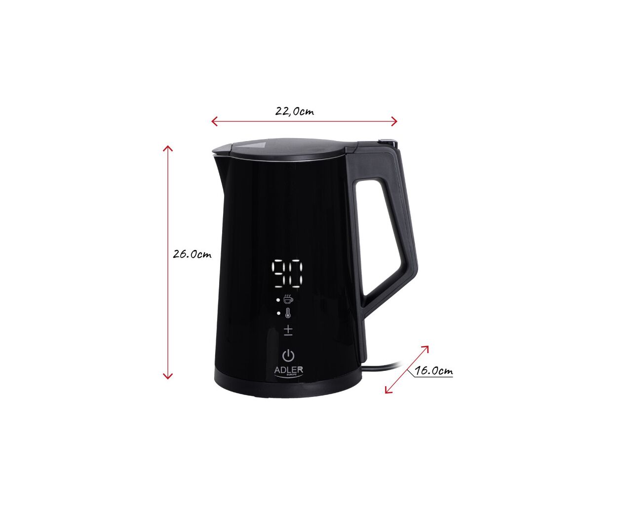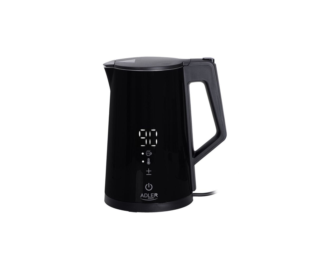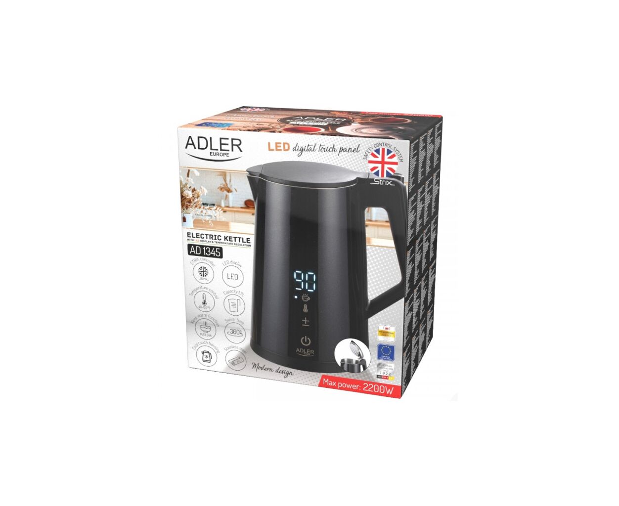 Чайник Adler AD 1345 – многофункциональный чайник мощностью 1850-2200 Вт и объемом 1,7 л. Он поддерживает регулировку температуры воды (40°C/55°C/80°C/90°C/100°C) и поддержание тепла в диапазоне 40-100°C в течение 24 часов.