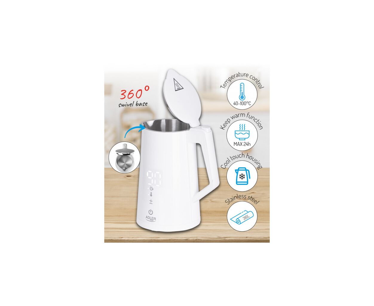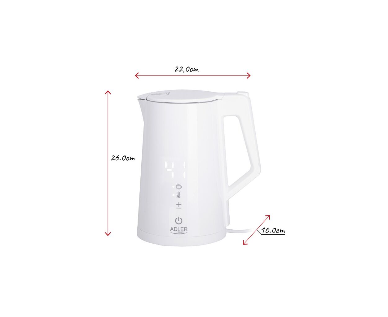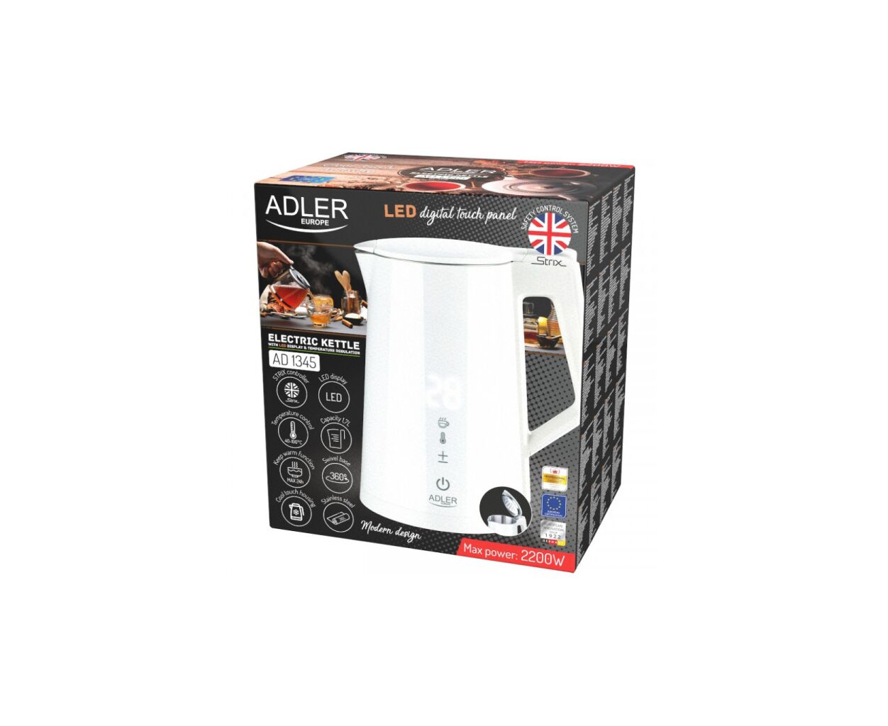 Чайник Adler AD 1345 – многофункциональный чайник мощностью 1850-2200 Вт и объемом 1,7 л. Он поддерживает регулировку температуры воды (40°C/55°C/80°C/90°C/100°C) и поддержание тепла в диапазоне 40-100°C в течение 24 часов.