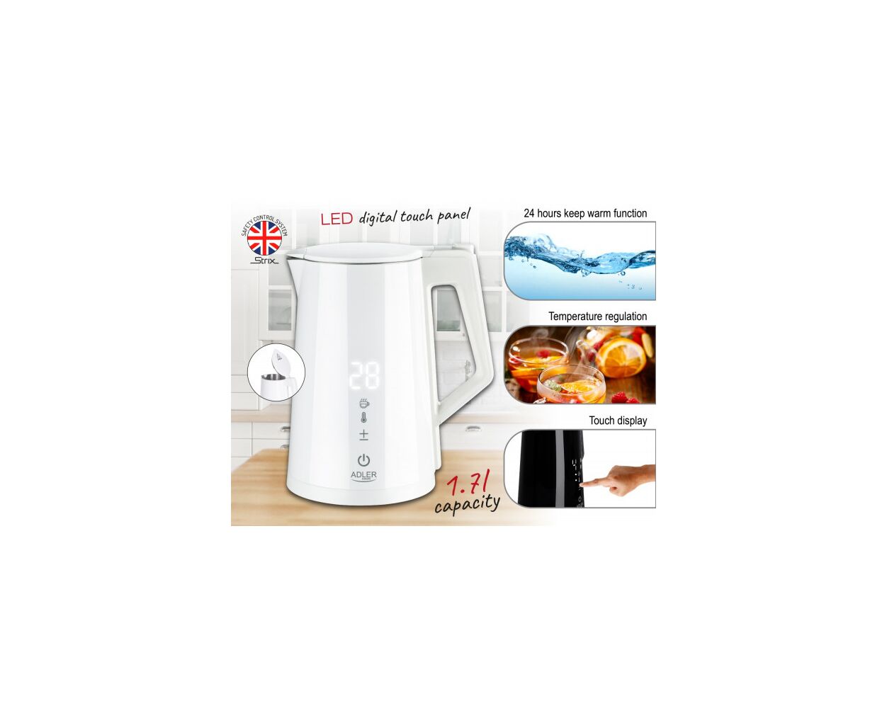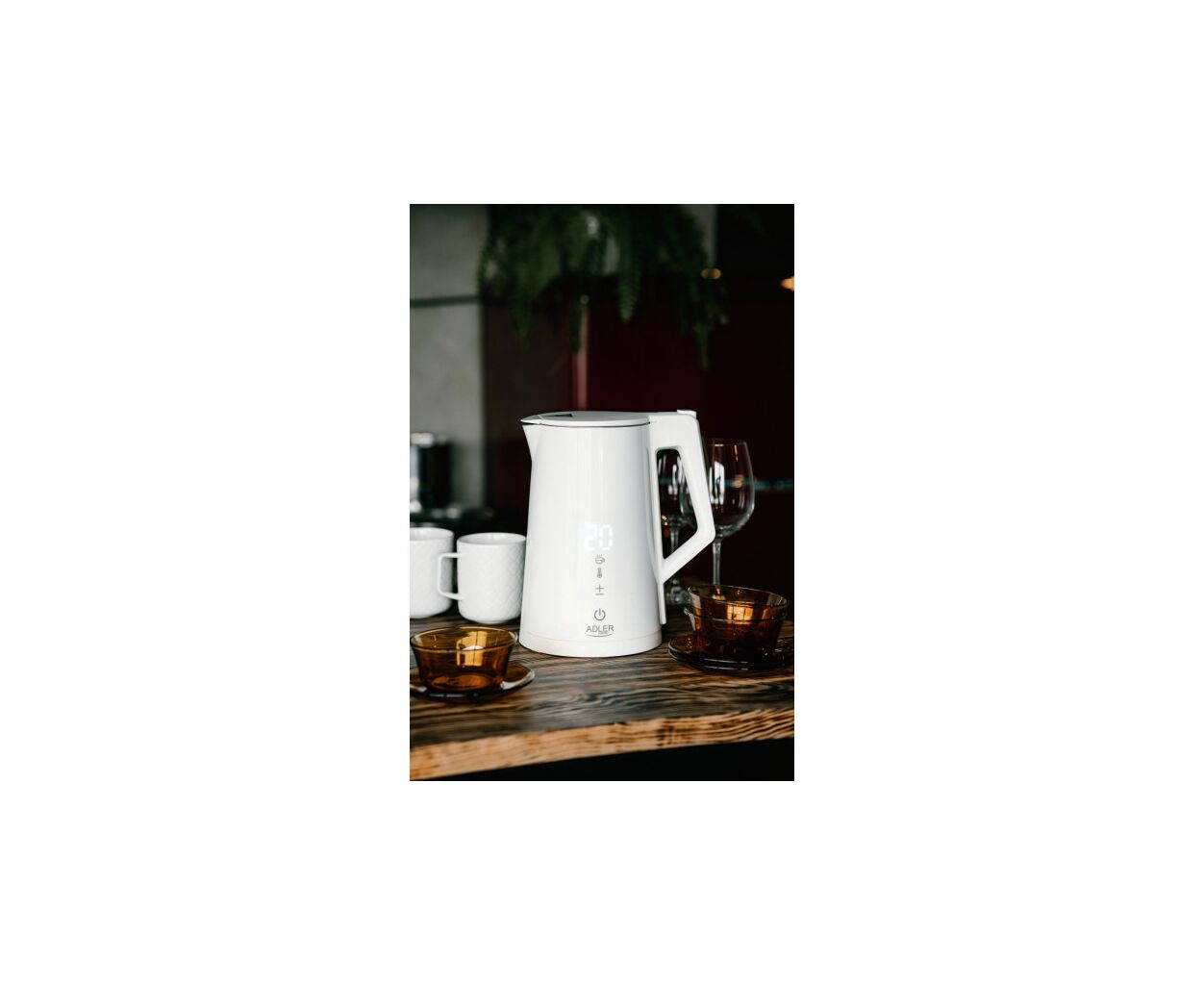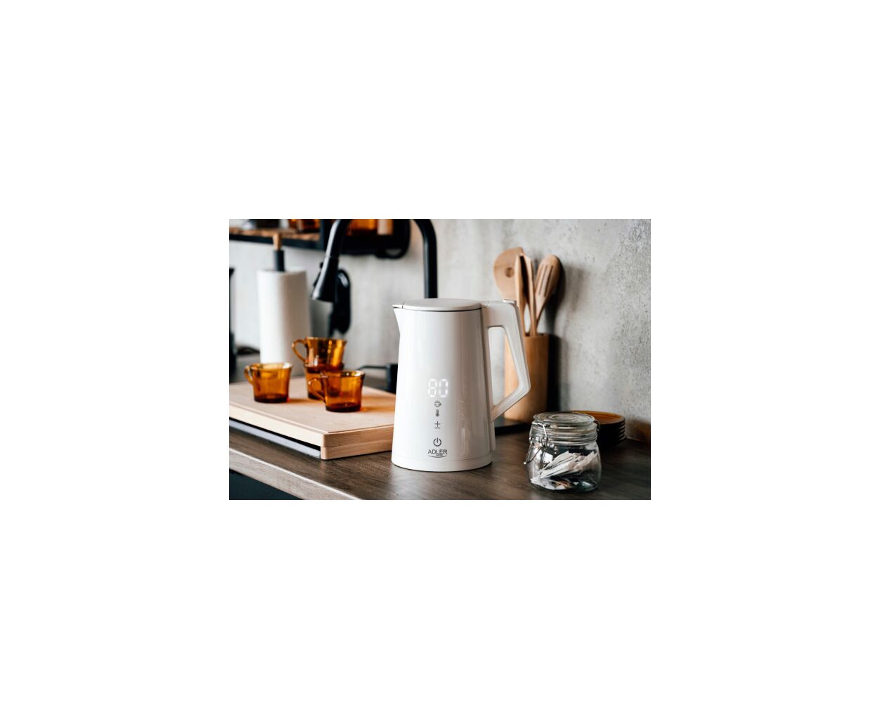 Чайник Adler AD 1345 – многофункциональный чайник мощностью 1850-2200 Вт и объемом 1,7 л. Он поддерживает регулировку температуры воды (40°C/55°C/80°C/90°C/100°C) и поддержание тепла в диапазоне 40-100°C в течение 24 часов.