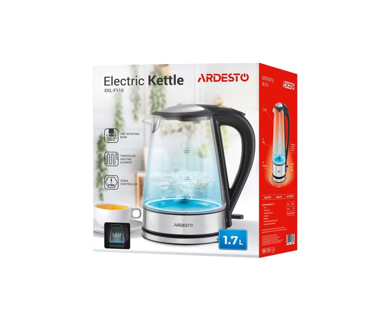 Одной из ключевых особенностей Ardesto EKL-F115 является система автоматического отключения при закипании воды, что обеспечивает дополнительный уровень безопасности и удобства. Для комфортного использования предусмотрена возможность вращения на 360° на базе питания, что позволяет легко разместить устройство на любой кухне, независимо от расположения розетки.