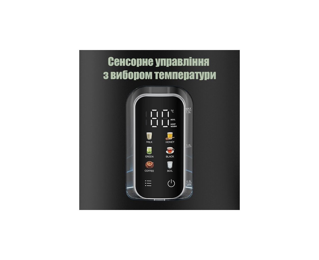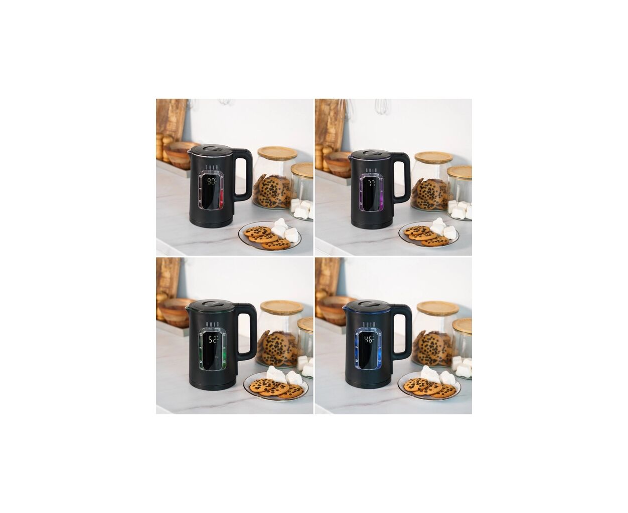 Особенно выделяется интеллектуальная сенсорная панель управления: с встроенным дисплеем, она отображает температуру и позволяет настроить режимы от 40°C до 100°C, чтобы идеально подогреть ваш напиток. Дисплей предоставляет нужную информацию о процессе нагрева и статусе поддержания температуры. Для тех, кто ценит эстетику, электрочайник оснащен светодиодной подсветкой, которая меняет цвета в зависимости от температуры воды, создавая визуальный эффект и добавляя элемент интерактивности.