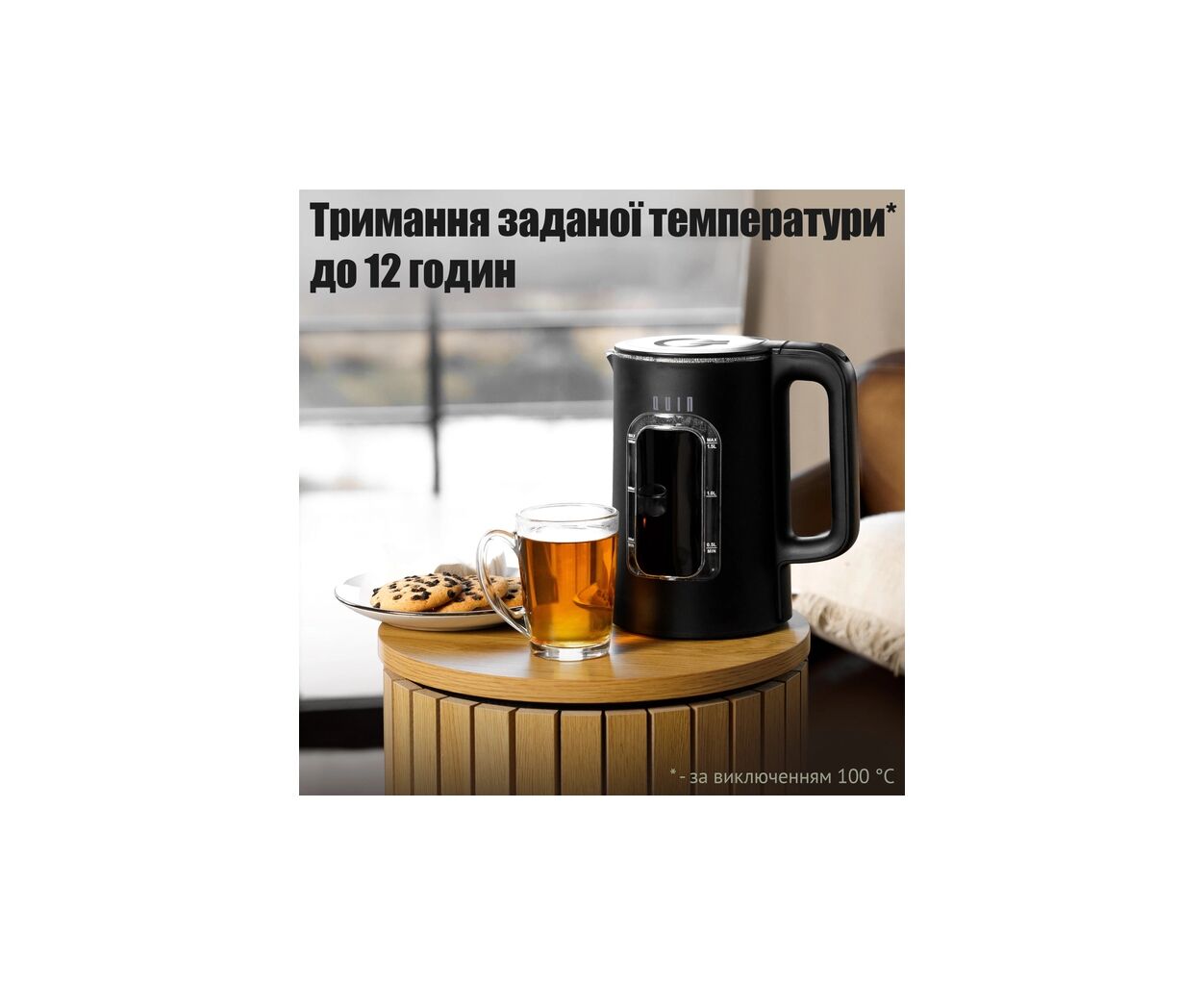 Чайник имеет двойные стенки, которые обеспечивают надежную теплоизоляцию: внутри использовано прочное боросиликатное стекло, а снаружи — термостойкий пластиковый корпус. Это не только сохраняет тепло внутри, но и обеспечивает безопасную температуру поверхности, предотвращая возможные ожоги. Еще одним преимуществом является поворотная база на 360°, которая позволяет удобно использовать электрочайник с любого угла.