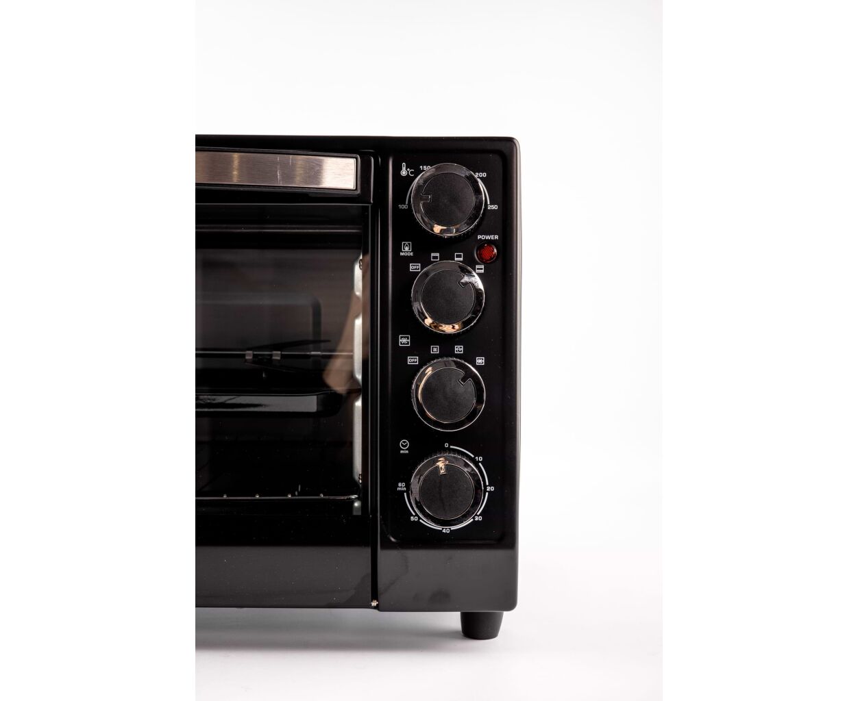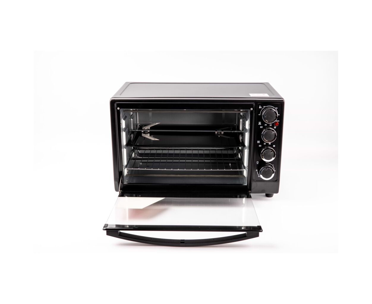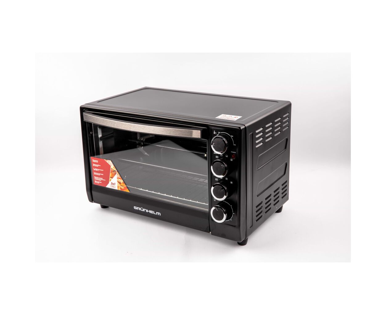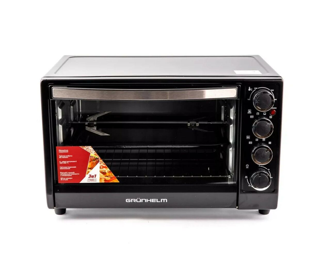 Встроенный конвекционный вентилятор создает вращающийся воздушный поток, чтобы во всем внутреннем объеме печи температура была одинаковой. Настольная духовка Grunhelm GN3501ARC управляется механическими поворотными выключателями на вертикальной панели. Модель комплектуется листом и решеткой.