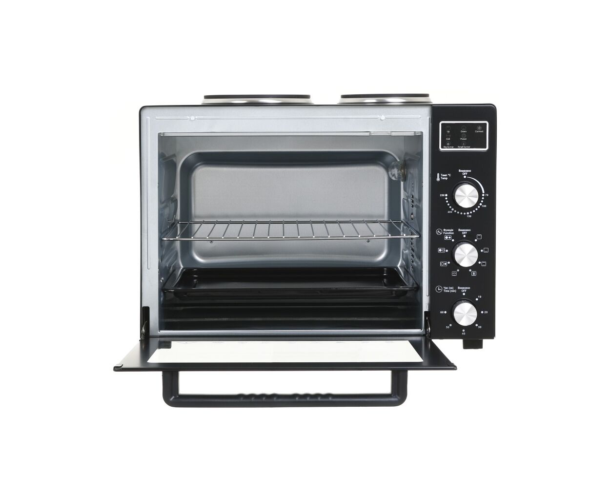 • 8 режимов нагрева: верхний, нижний, комбинированный, комбинированный с конвекцией, комбинированный с грилем, маленькая конфорка, большая конфорка, обе конфорки